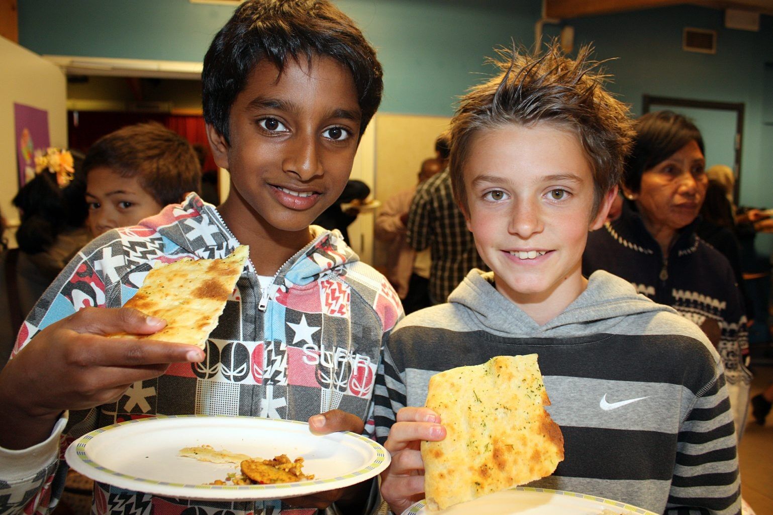 Som vanlig var matfestivalen på Veitvet skole en stor suksess. Kameratene Jeenu (13) og Didrik (13) er to av mange som smaker på mat fra alle verdenshjørner.