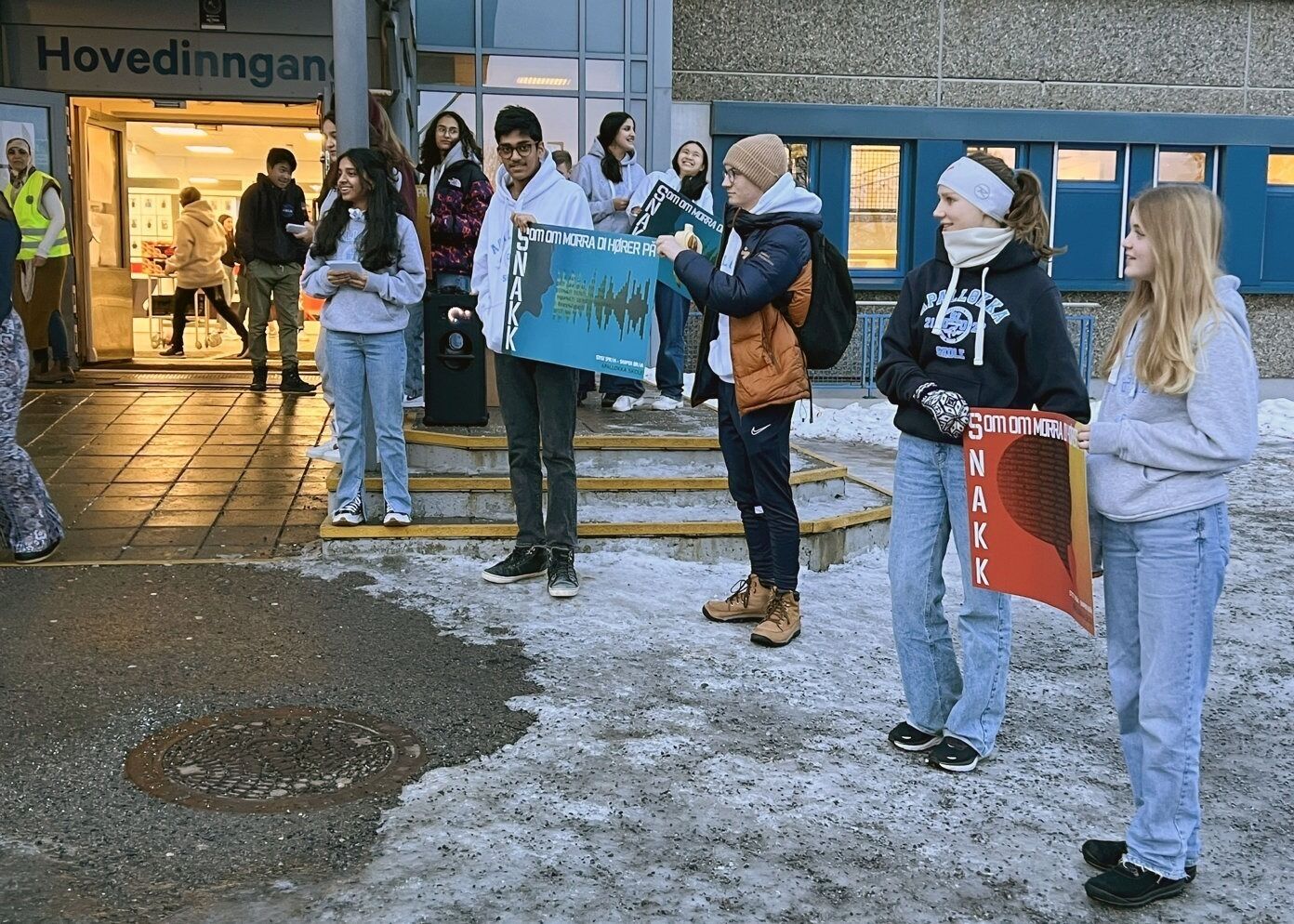 – Vi sto utenfor med plakater, og alle har på seg Apalløkka-genserne sine. Så det er åpenbart noe hyggelig som skal skje denne uka. Og det er språkkampanjen.
