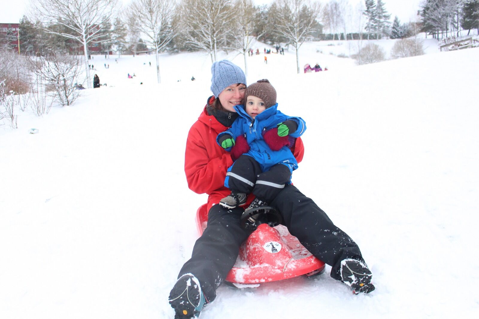 KOM SEG UT: Maren Dahle Lauten og Sigbjørn syns det var stor stas med snøfallet, og benyttet muligheten til en liten aketur eller ti. Foto:Bilde 1 av 4