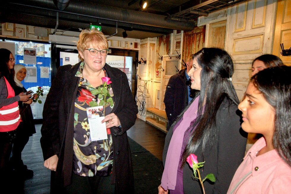 VELKOMST: Med utdelt rose i hånda ankommer kunnskaps- og integreringsminister Trine Skei Grande (V) Deichman på Stovner og ønskes velkommen av Nasreen Begum og datteren Fatima Ahmed. Foto:Bilde 1 av 1 Solid markering av kvinnedagen på Stovner Rolf Kristiansen Publisert 10. mar 20 kl. 10:33 Del på sosiale medier Del Facebook Twitter E-post Abonnement
