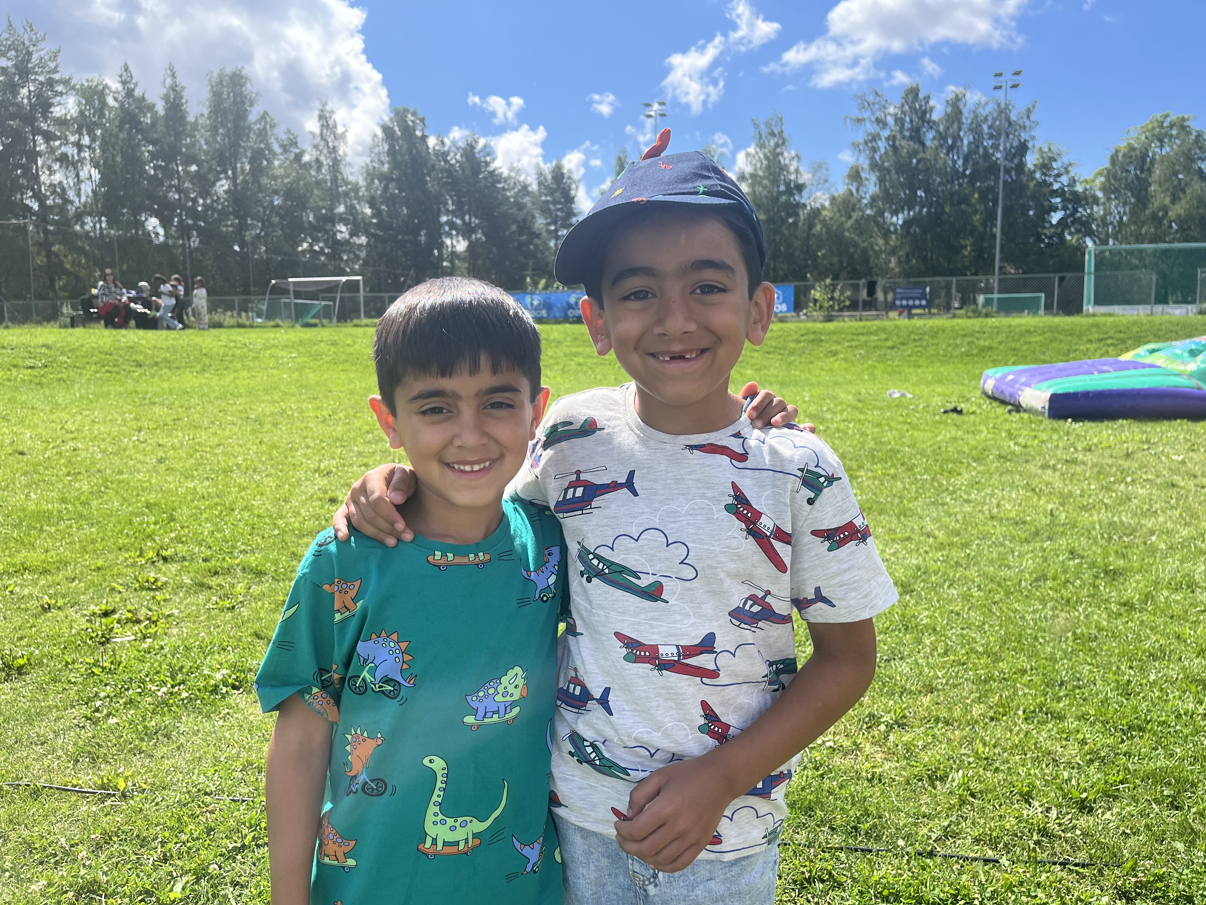 Brødrene Hassan og Isak nyter sommersola på Furuset, hvor de store hoppeslottene og luftmadrassene nettopp er blitt montert av instruktørene. Avisen huket tak i brødrene for å høre hva de tenkte om campen.