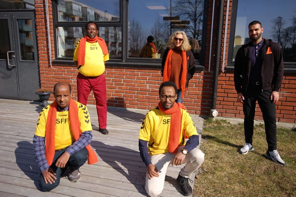 VIL INFORMERE: Denne gjengen vil gå rundt to og to på Stovner og snakke med folk og gi informasjon. Med god spredning står Abdilahi, Gudrun og Husnain bak, mens Khayre og Shuyab står i knestående foran. Foto:Bilde 1 av 1