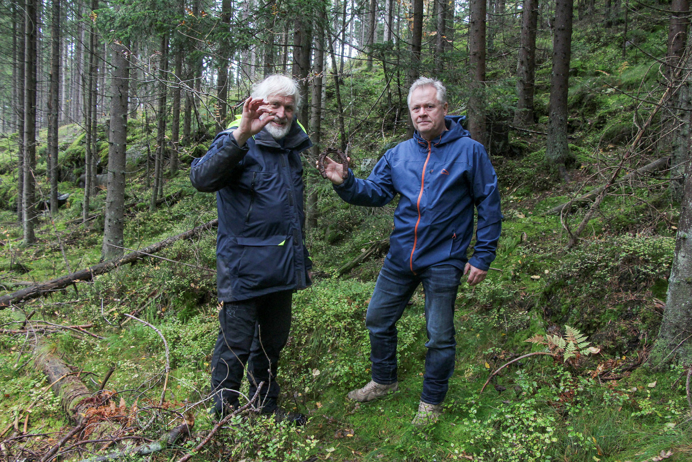FUNNSTED: Her fant Kim Steinar Kjærner-Strømberg (t.h) de to gjenstandene, ei blykule og en hestesko, med bruk av metalldetektor. Foto: Sindre Veum ApnesethBilde 1 av 1