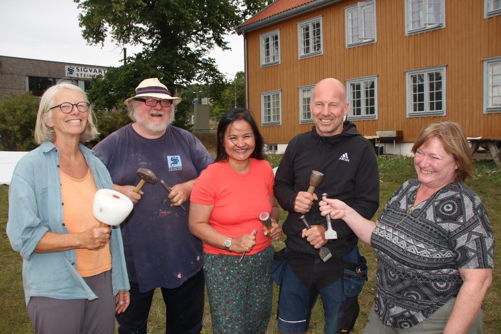 KLARE FOR FESTIVAL: Kirsten Berrum (f.v.), Chris Fleurie, Cecilia Rockwell, Steinar Enerly og Frøydis Arnesen gleder seg til alle deltakerne er på plass og startskuddet for årets steinhoggerfestival går. Foto:Bilde 1 av 23
