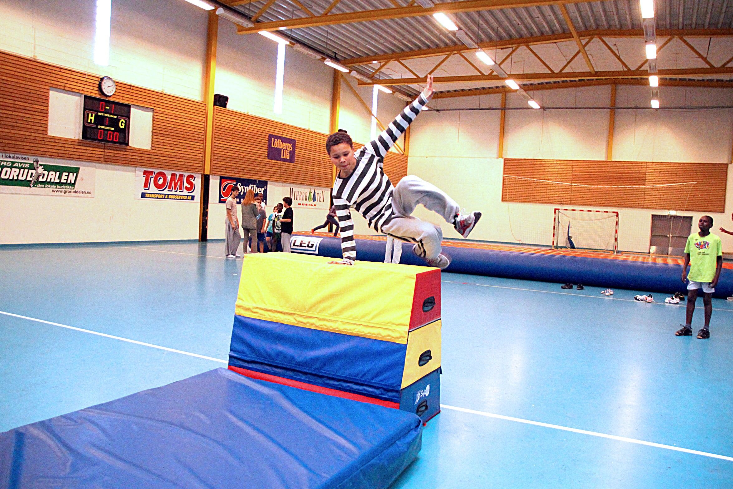 Barn fra Ammerud og Romsås fritidsklubb møtte opp i Furuset Forum for å lære om ekstremsporten parkour, sporten der man på akrobatisk vis skal komme seg over ulike hindre.