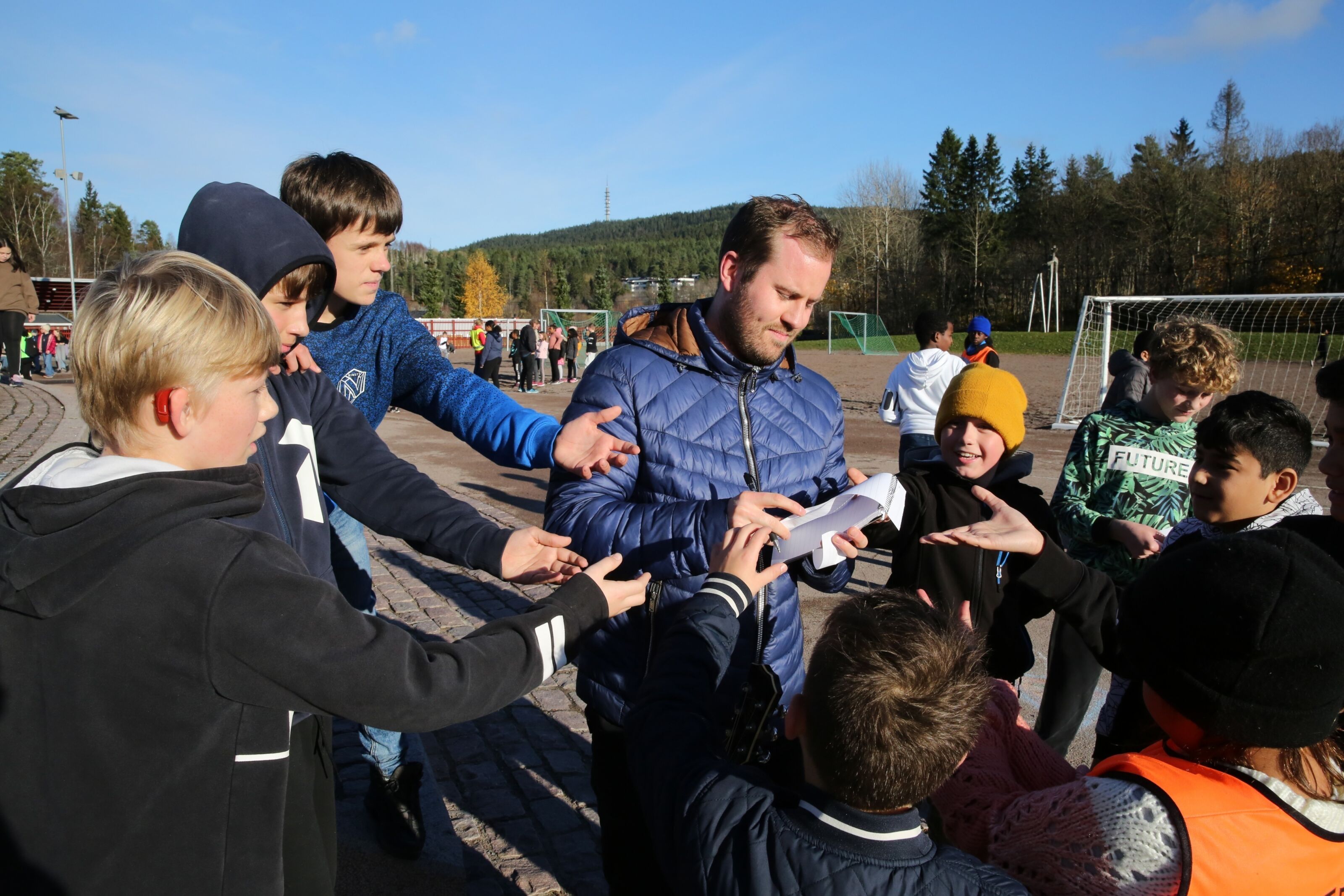 AMMERUD: Knut Marius besøkte elevene på Ammerud skole sist torsdag, før han lørdag skulle på scenen i den store finalen i Stjernekamp. Det måtte nødvendigvis skrives en del autografer... og vips så har navnetrekket hans fått litt større betydning etter kveldens seier. Foto:Bilde 1 av 3