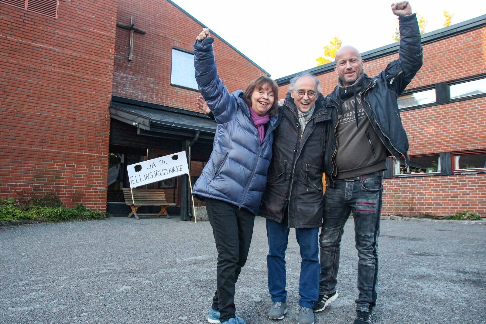 JUBLER FOR KIRKEN: Kari Gladtvet, Bjørn Engstrøm og Lars Samuelsen kan juble igjen - for nå er Ellingsrud kirke reddet. Foto:Bilde 1 av 2For å se disse bildene må du ha et abonnement Striden om Ellingsrud kirke er over! Nå blir den soknekirke igjen Ørjan Brage Publisert 20. feb 20 kl. 19:40 Del på sosiale medier Del Facebook Twitter E-post Abonnement