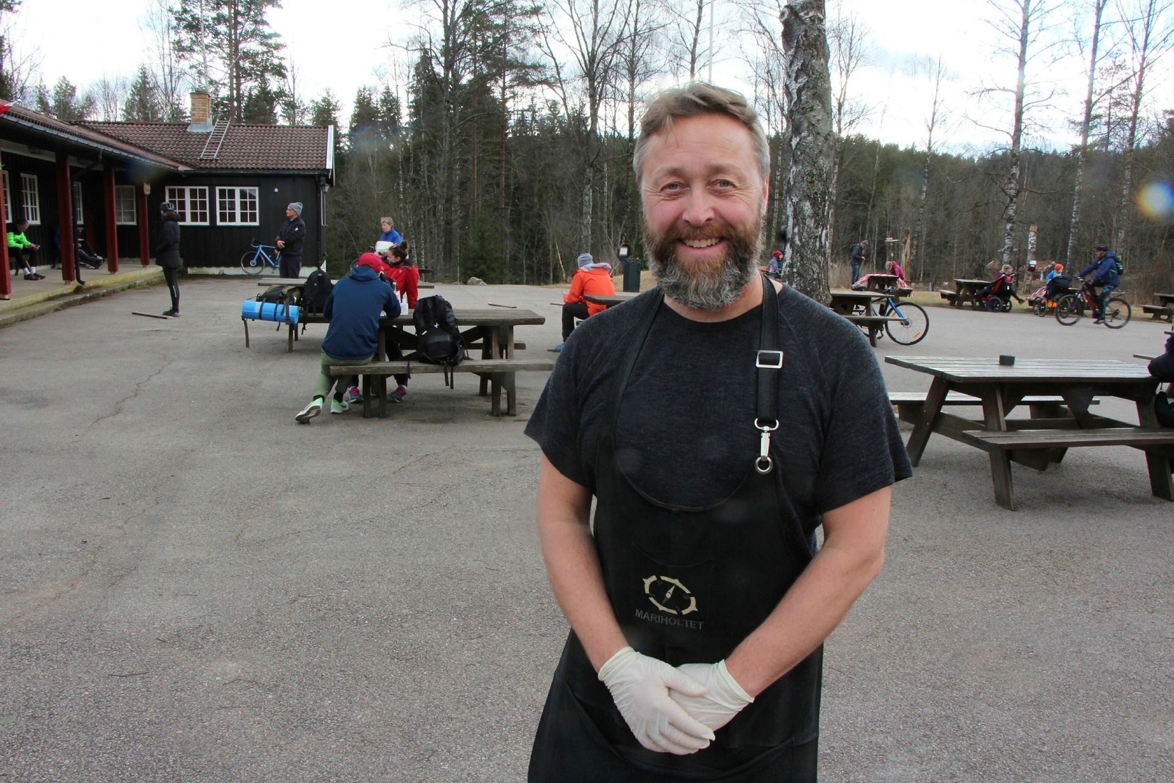 GOD PÅSKE: Bestyrer Jan Erik Nordby ved Mariholtet Sportsstue håper på fint påskevær og lover å kunne servere vafler og kakao til dem som besøker Mariholtet-kiosken. Foto:Bilde 1 av 1