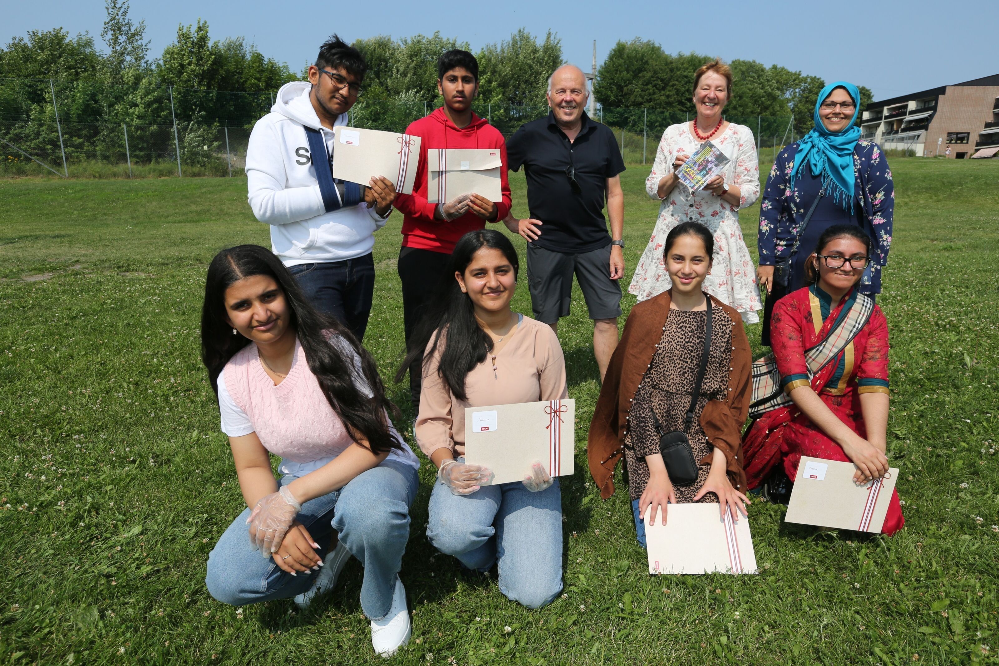 FORTJENT HEDER: Flere av de unge forfatterne av boka «Hånda som skriver» fikk utdelt diplom av ordfører Marianne Borgen. Sammy Yaqub Mirza (17) (b f v), Timur Salek Mehmood), forfatter og leder av skrivekurset Roger Pihl, ordfører Marianne Borgen, leder i Samhold i mangfold og frivillighetsarbeid (SIMOF), Attia Mirza Mehmood. Natasha Saqlain (13) (f f v), Namira Nawez (14), Sumayyah Omar (12) og Saera Iffat Mirza (19). Foto: Rolf E. WulffBilde 1 av 2