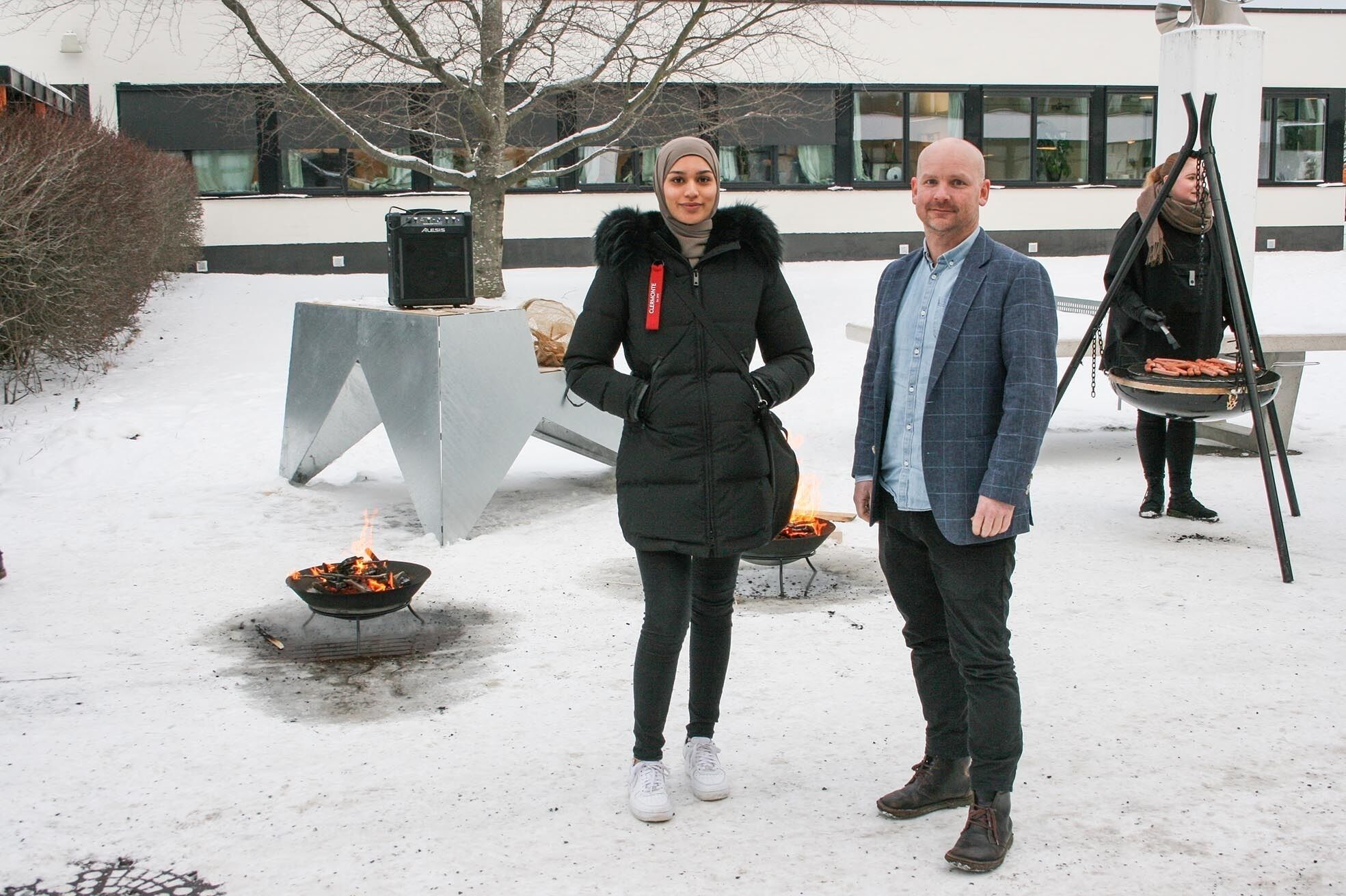 HYGGELIG PÅ HELLERUD: Zainabh Ali (t.v.) og rektor Arnfinn Stautland gleder seg til å vise frem Hellerud videregående 27. januar. Foto:Bilde 1 av 1