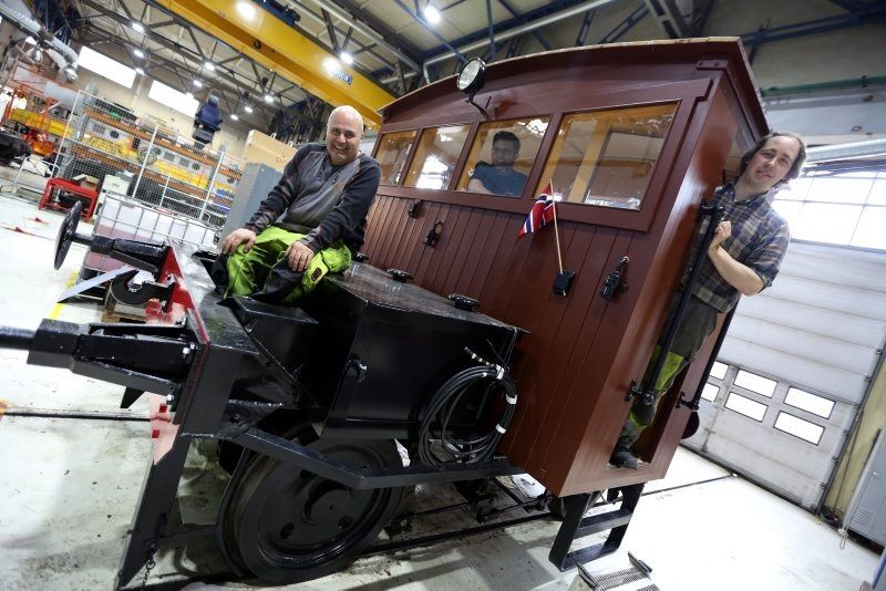 BLIDE TOGREPERATØRER: Simen P. Aasheim (t h) har ledet prosjektet med å restaurere det elektriske motorvognsettet SKA 205 nummer 2. I forbindelse med dreiing og finsveising har han fått frivillig hjelp av Rune Pettersen (foran) og Yasin Rafiq fra Jernbanens Idrettslag på Mantenas verksted på Grorud. Foto:Bilde 1 av 4