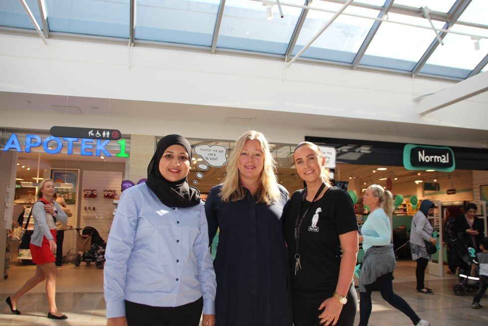 NYE PÅ SENTRET: Herra Iqbal fra Apotek 1 (t.v.) og Marika Hagen fra Normal er begge veldig fornøyde med onsdagens åpning av de nye butikkene. Her står de sammen med senterleder Gudrun Røed (midten). Foto:Bilde 1 av 1