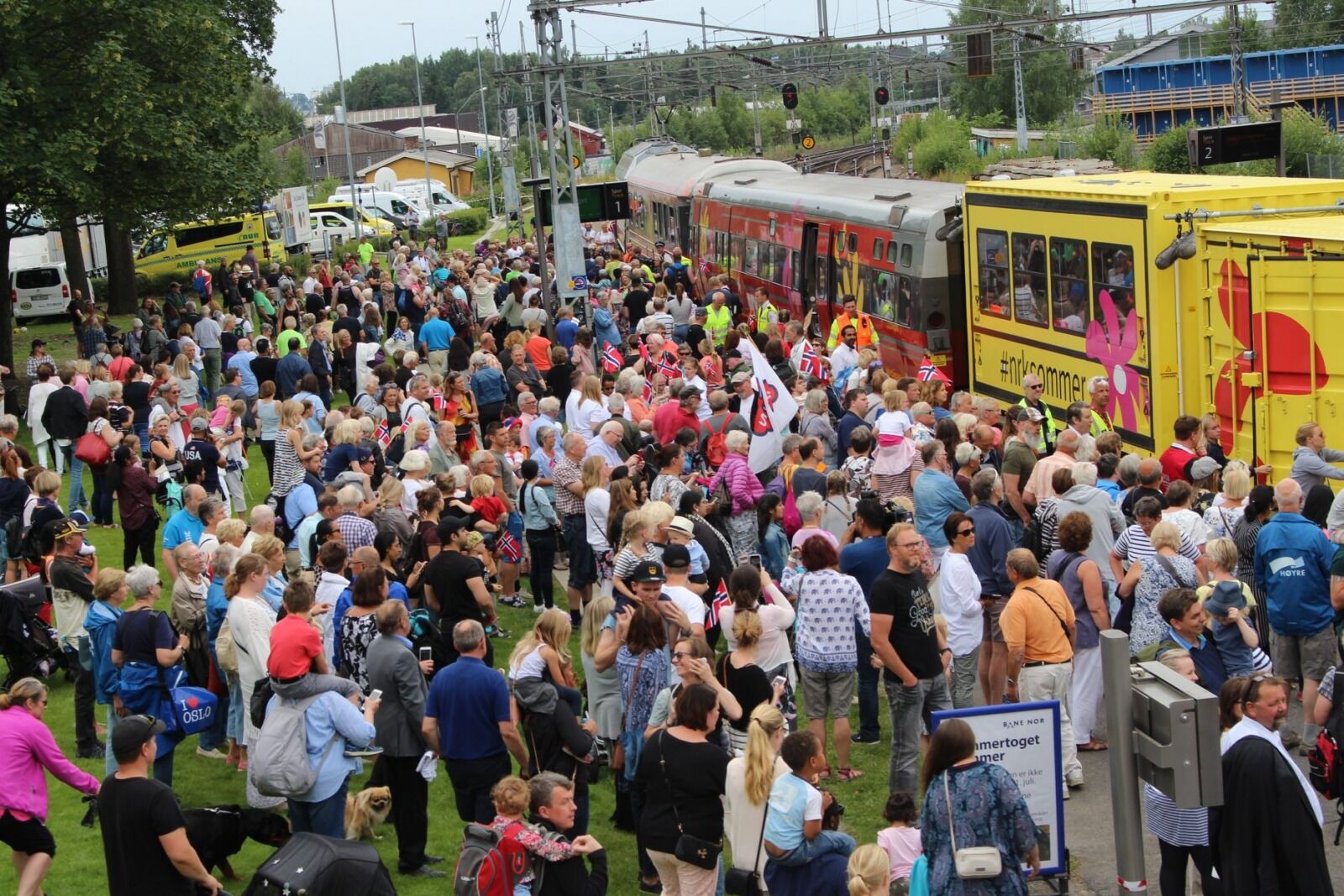 Toget står nå på Grorud stasjon og festen er i gang. Groruddølene tok oppfordringen på strak arm og langs perrongen sto både store og små med flagg i hånda.