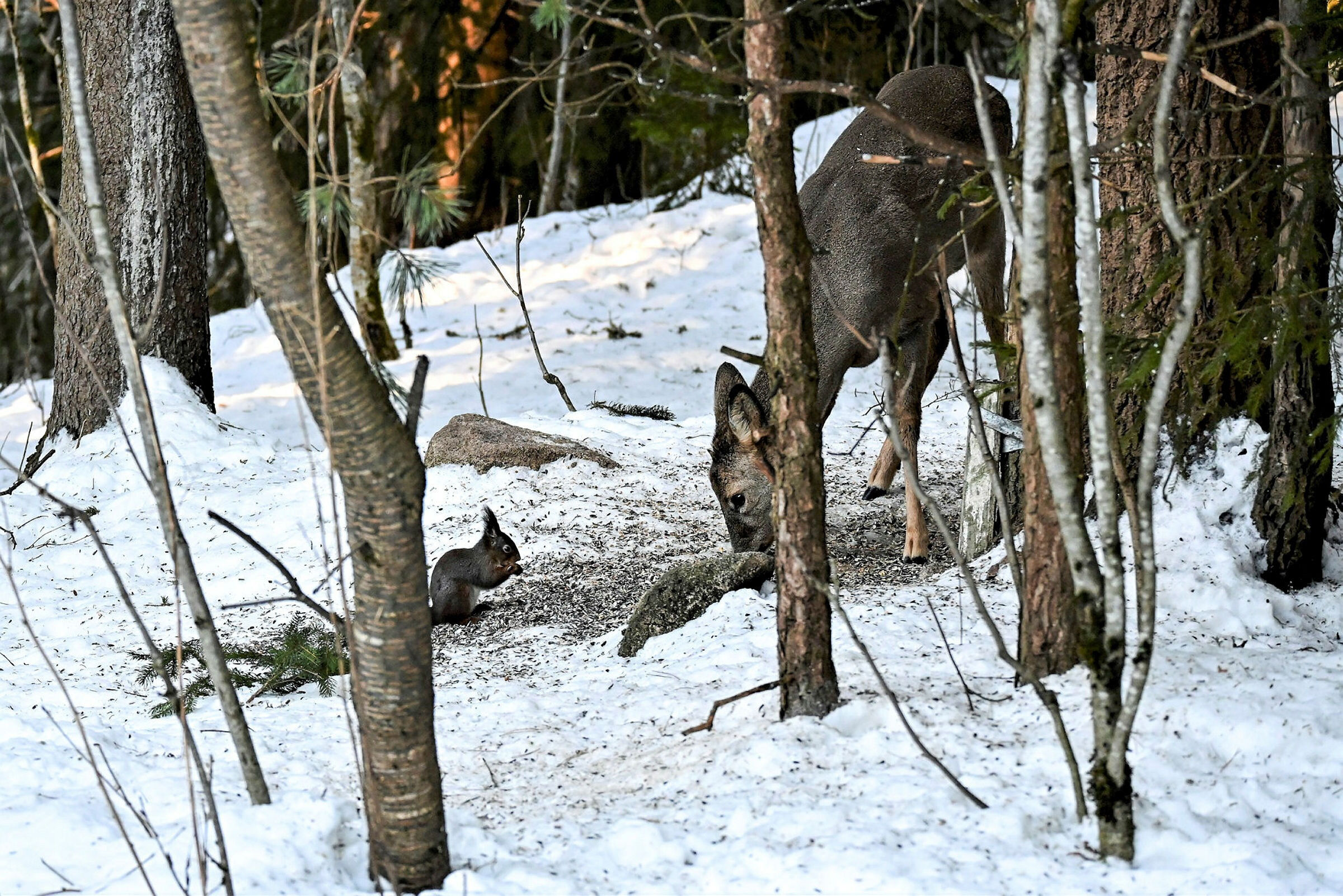 Ekornet og rådyret hadde verken problemer med å dele maten seg i mellom, eller fotograf Terje Yngve Johnsen som kom tett på festmåltidet.