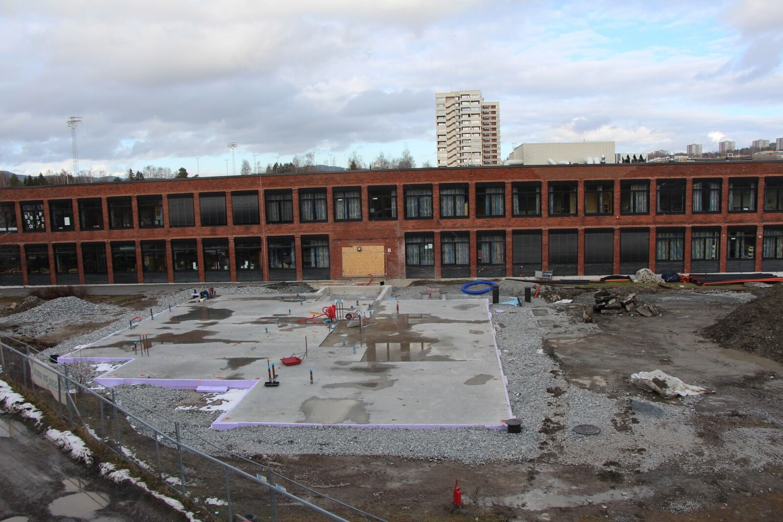 DET BYGGES: Her skal det nye tilbygget reises og huse blant annet bibliotek og spesialrom. I bakgrunnen kan man skue høyblokka i Nåkkves vei. Foto:Bilde 1 av 2