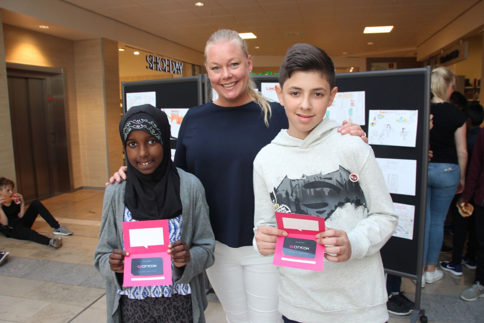 Elias (12), Selma (11) og Mathumintha (11) tegnet seg til seier da senterleder ga 6. trinn på Linderud skole i oppgave å tegne sentret om 50 år.