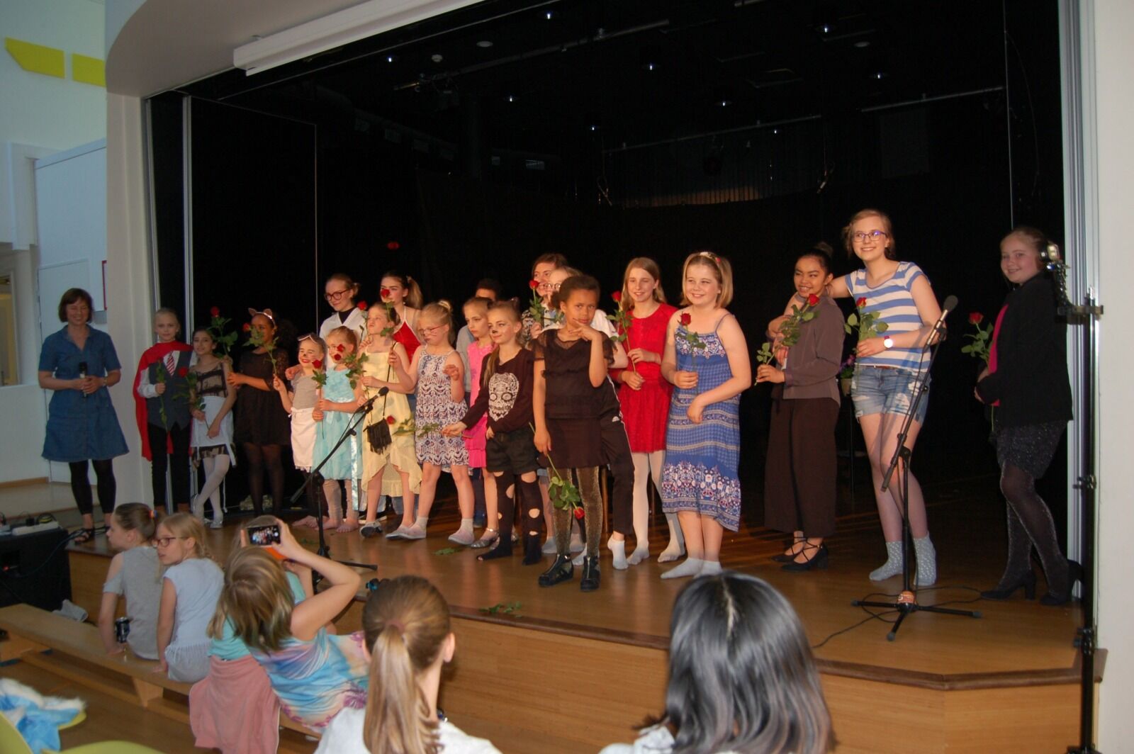 SMÅ OG STORE: Skuespillere fra begge forestillingene samlet på ett brett med fortjente blomster. Regissør, instruktør og manusfor-fatter Sarina Nachtnebel (i blått) helt til venstre. Foto:Bilde 1 av 1