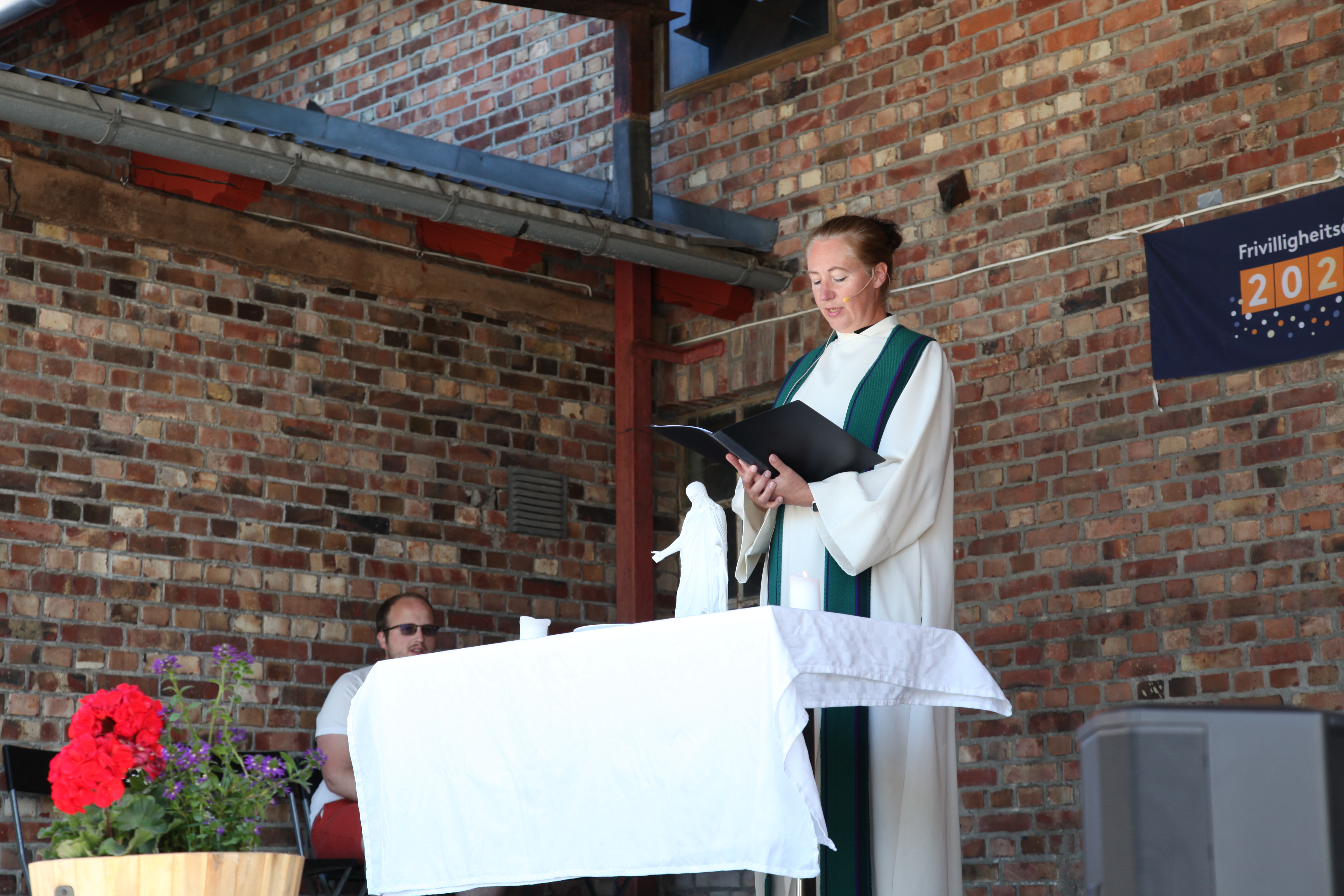 PREKEN: Sokneprest Liv Arnhild Romsaas holdt prekenen under utegudstjenesten. (Foto: Tom Evensen). FOTO: Tom EvensenBilde 1 av 1
