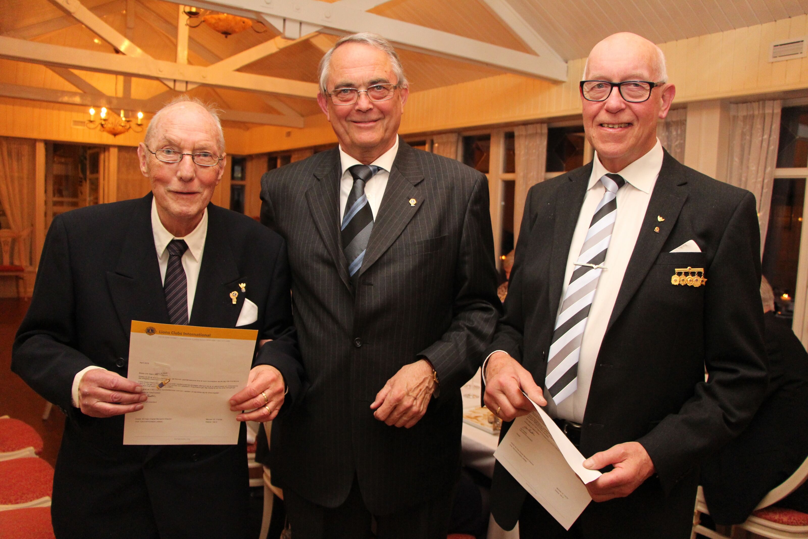 BLE HYLLET: Chartermedlemmene Bjørn Willy Petterson og Per Opsahl fikk hver sin nye pin og takkebrev for 40 år i klubben. De ble hyllet av alle, ikke minst president Tor Mørk. Foto:Bilde 1 av 1 Stovner Lions 40 år: Veteranene ble hyllet Caroline Bremer Publisert 14. apr 15 kl. 10:28 Del på sosiale medier Del Facebook Twitter E-post Abonnement