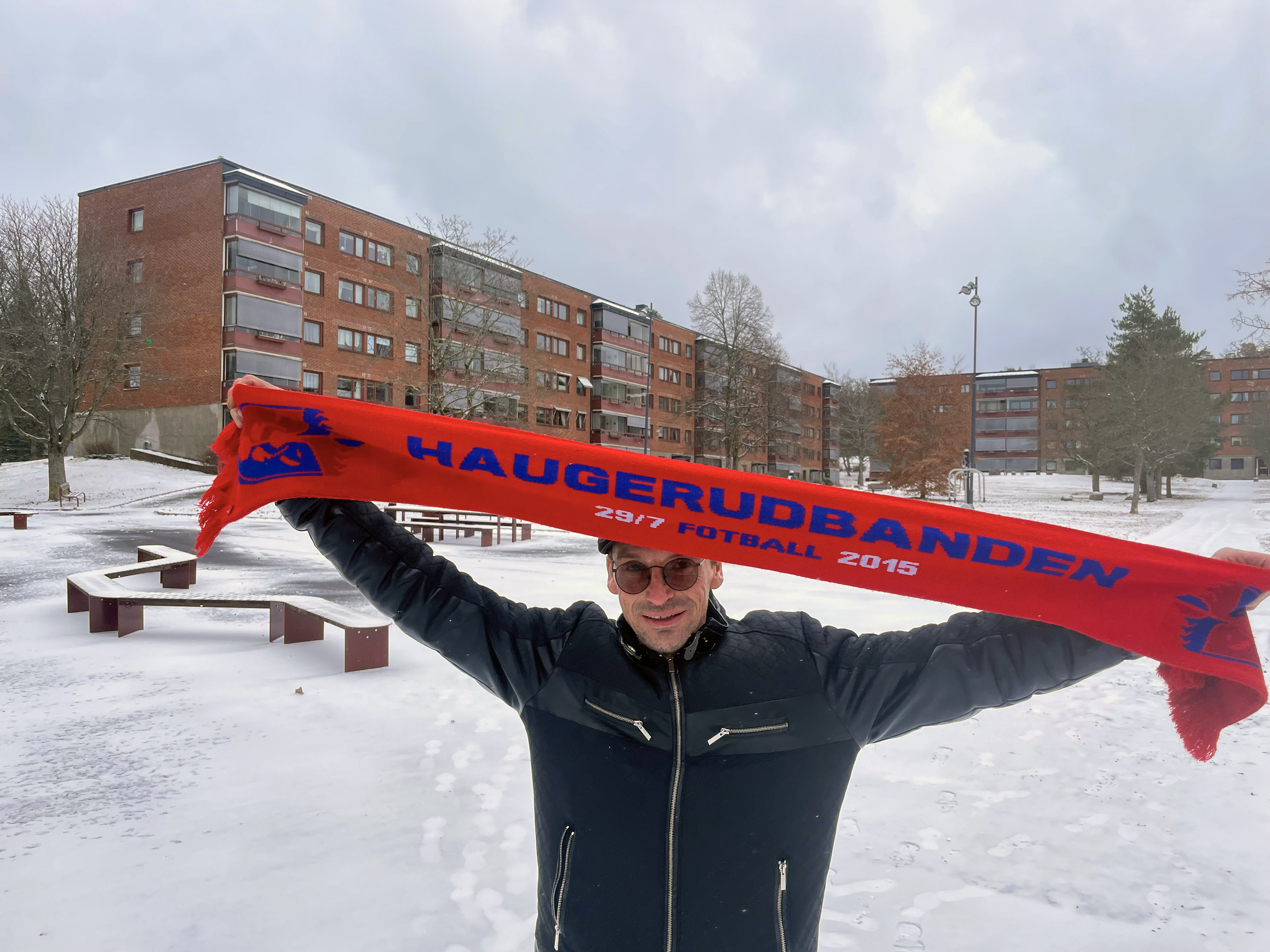 FORAN BLOKKA DER ALT STARTET: Frank Hoen viser stolt fram Haugerudbanden-skjerfet sitt og poserer foran blokka han vokste opp i. Moren bor der fortsatt. FOTO: Nikolai HjetlandBilde 1 av 3
