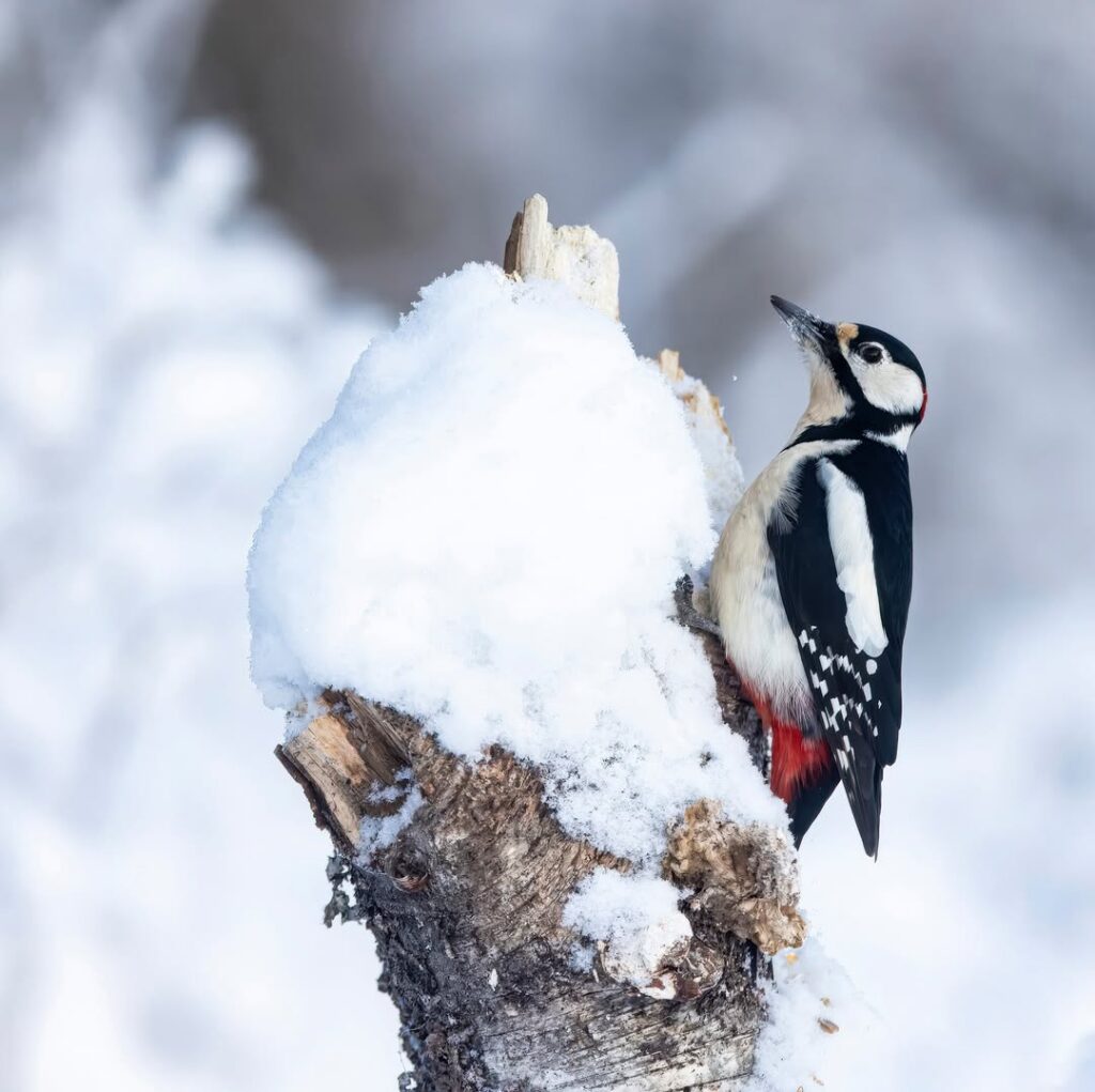 Flaggspett i vinterlandskap