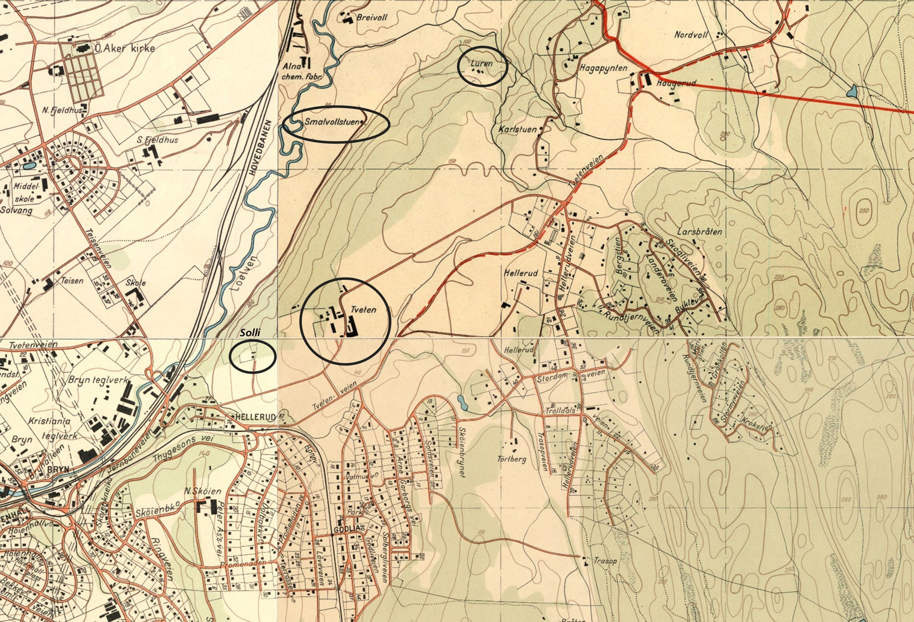 Tveten gård og de tre husmannsplassene er markert på kartet fra 1938. Foto:Bilde 1 av 8