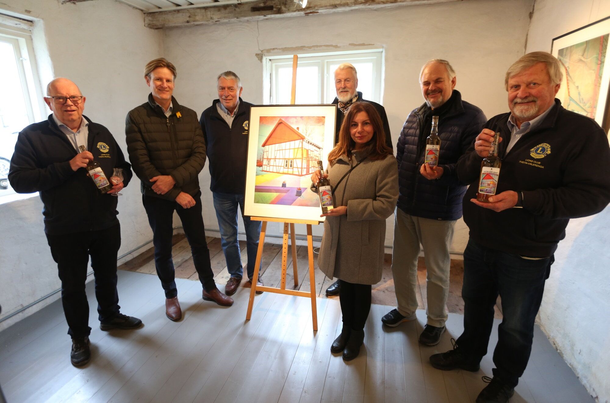 BLID AKEVITTGJENG: Roger Yttervik (Lions) (f. v.), daglig leder i Atlungstad Håndverksdestilleri, Romain Jourdan, Rune Hageselle (Lions), akevittlegende Halvor Heuch, Tore Karlsson (Lions) og Jan Kjell Daffinrud (Lions) kunne stolt vise frem Tveten Gård Aquevit som ble lansert på onsdag. De er også enige om at de ikke kunne finne en bedre logo på flaska enn maleriet av brenneribygget som Violet Polsangi står bak. Med andre ord, akevittlansering på gammel akevittgrunn i brennerihuset som også er akevittflaskens logo. Foto:Bilde 1 av 4