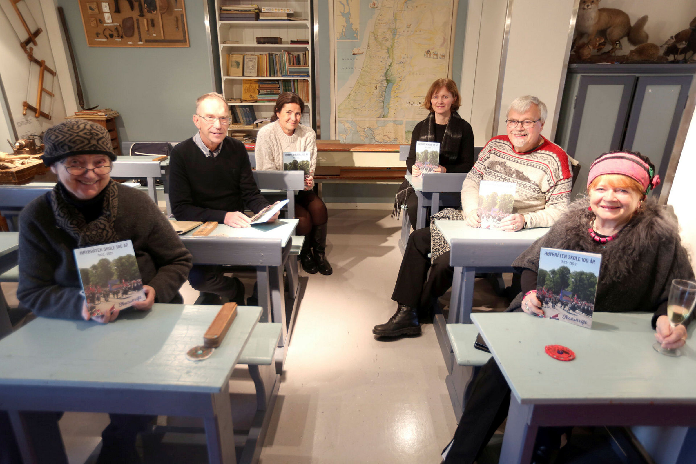 Tidligere lærere, rektorer, elever og redaktører/skribenter om hverandre. Gro Strømme (f.v.) har bidratt sterkt til boken og er tidligere lærer ved Høybråten skole, Jan Gunnar Braathen, tidligere rektor med solid Høybråtenblod i slekta, Ricke er dagens rektor og Anette Døvre en av dagens lærere, mens Rolf E. Torbo og Frøydis Cederkvist Stenerud er tidligere elever og historiebokens redaktører/skribenter - og selvsagt med solid Høybråtenslekt å vise frem til begge to. Foto: Rolf E. WulffBilde 1 av 1