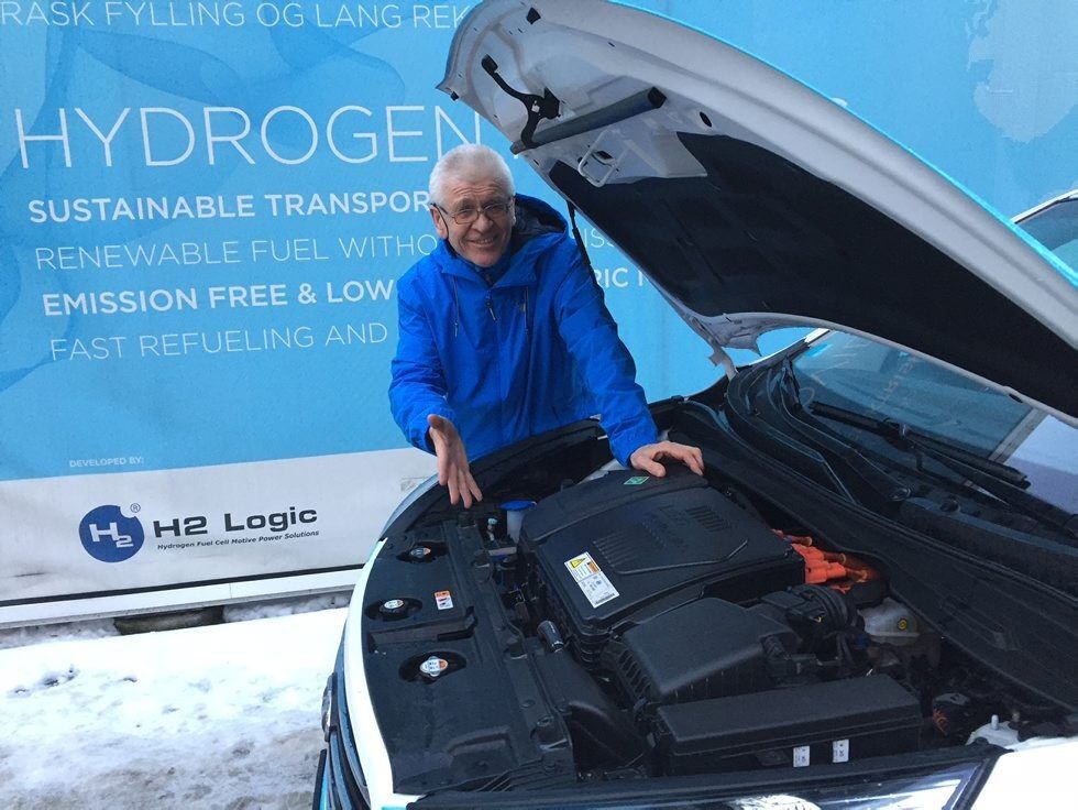 FORNØYD BILEIER: Oddvar Røyset kan konstatere at det ikke er sylindre eller noe som går rundt i dette FuelCell motorrommet - kun over 300 celler som omsetter hydrogen til 135 hestekrefter. : Oddvar Røyset kan konstatere at det ikke er sylindre eller noe som går rundt i dette FuelCell motorrommet - kun over 300 celler som omsetter hydrogen til 135 hestekrefter. Foto:Bilde 1 av 2