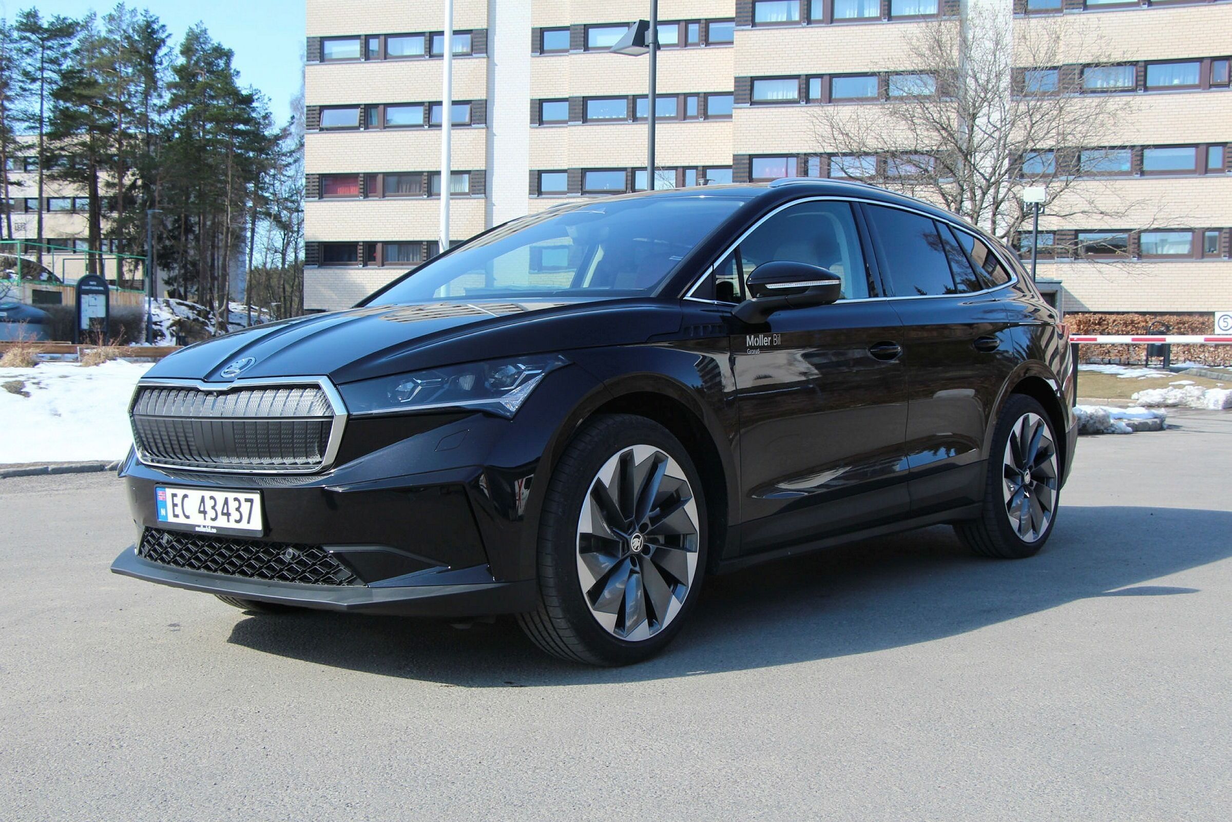 SKODA ENYAQ IV: Dette er Enyaq i korte trekk; Komfortabel, stillegående med meget bra støydemping, god bakkeklaring, flotte linjer, myk og behagelig på veien. Dette er en bil det er verdt å vente på. Foto:Bilde 1 av 4