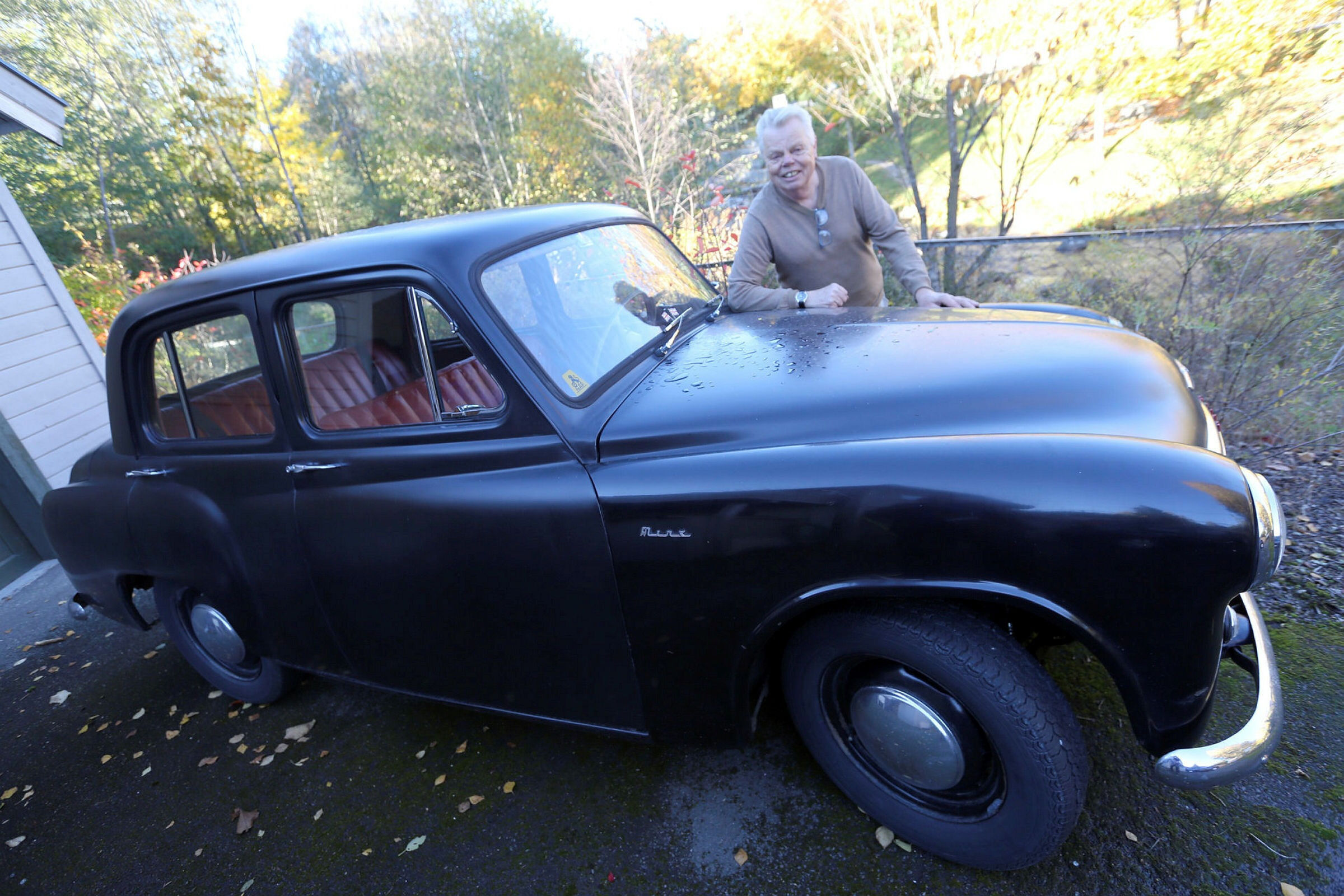 – Jeg bare utfører min oppgave som veteranbilbarnevakt, humrer Tom. «Barnets» navn er en engelsk-produsert Hillman Minx, årgang 1955.