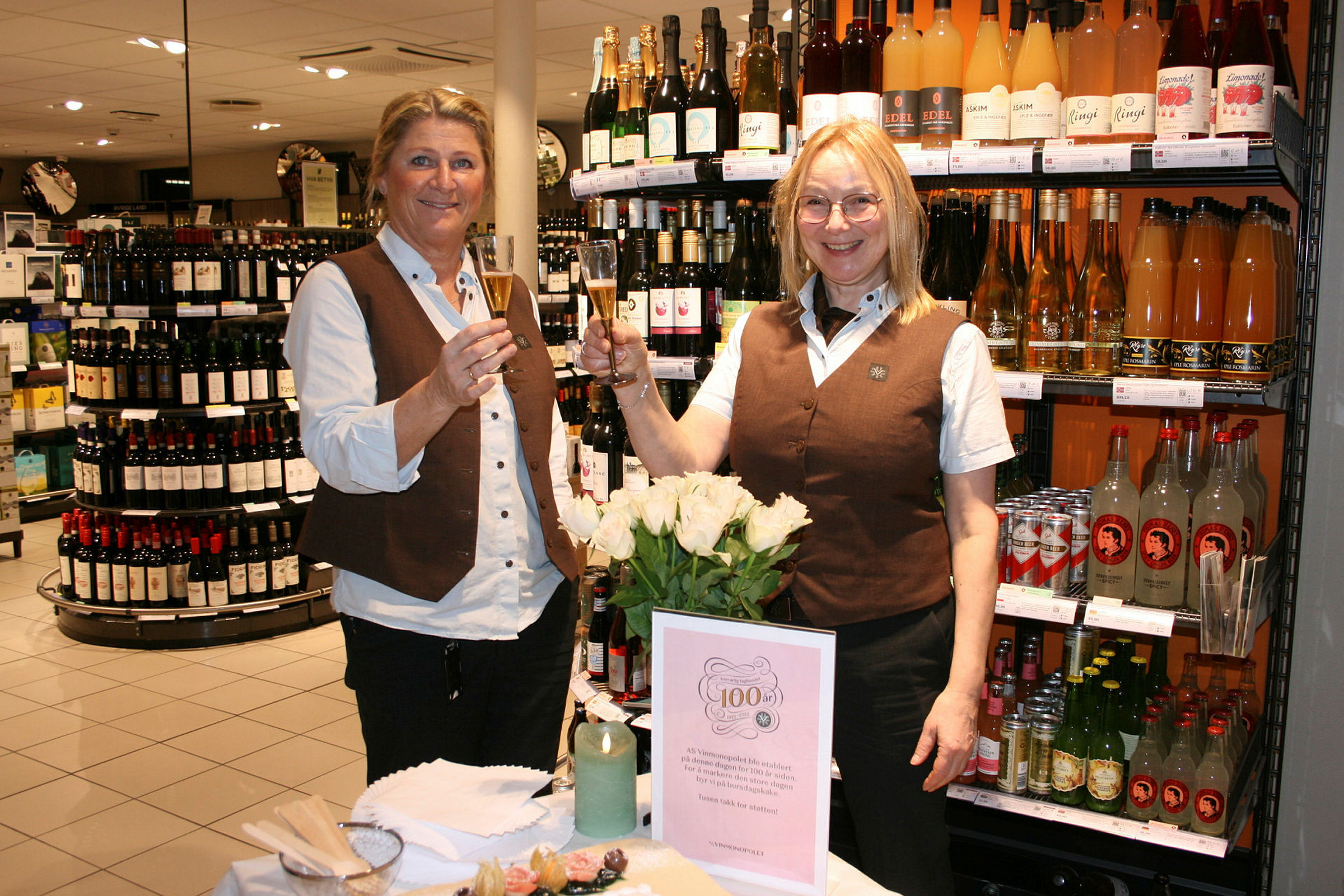 25 ÅR: Siv Anine Moen (t.v.) og butikksjef Aud Søyland har jobbet i Vinmonopolet i 25 år hver. Nå skåler de for arbeidsplassen, som har holdt det gående i 100. Foto: Caroline HammerBilde 1 av 1