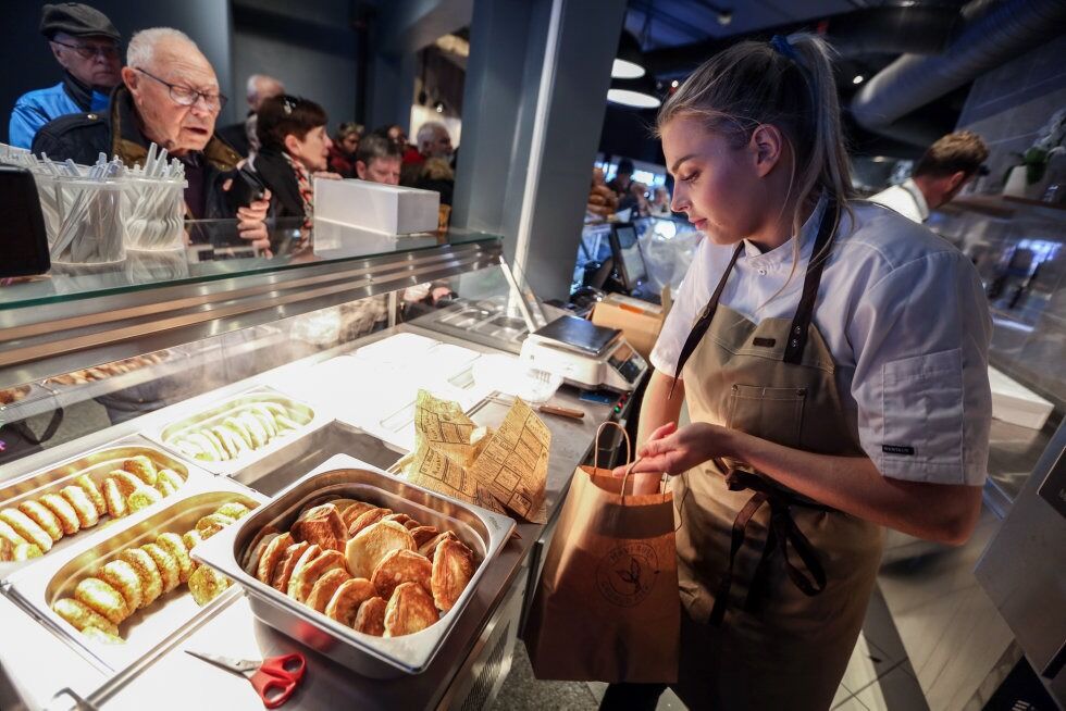 PÅ HJEMMEBANE: Tor Haug kan endelig kjøpe fiskekaker på Grorud senter igjen. Her ekspederes han av daglig leder Mariell Olsen. Foto:Bilde 1 av 5
