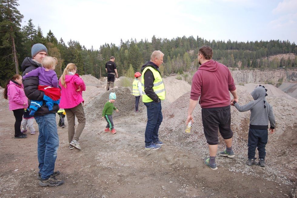 HOLDT AVSTAND: Barna ble bedt om ikke å gå for langt ut på kanten av avdelingsleder Fredrik Brubakk. Derfor var det trygt å bli holdt i hånden, sitte på pappas arm eller bli fotefulgt av mamma. Et av de større barna er iført korrekt antrekk:Rød hjelm og gul vest. Foto:Bilde 1 av 1