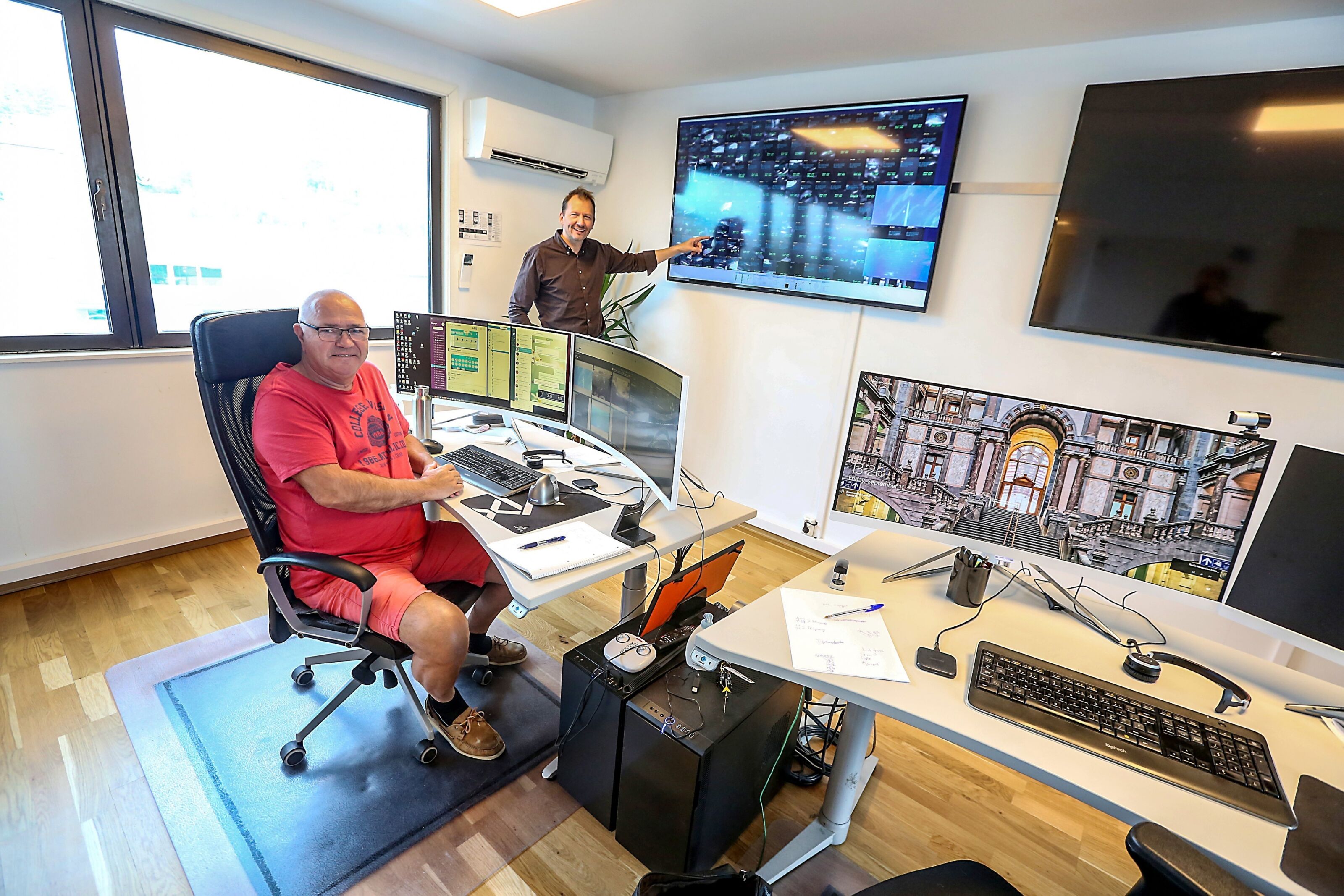 FULL OVERSIKT: Fra «flytårnet» i Stålfjæra kan «flyveleder» Lasse Langeland (foran) overvåke samtlige lasernoder som er plassert i merder langs kysten. Laserskuddene kan tydelig ses på skjermene. Det overvåkes og behandles over 20 millioner laks døgnet rundt hele året. Daglig leder John Arne Breivik vet at Lasse til enhver tid har full oversikt. Foto:Bilde 1 av 4