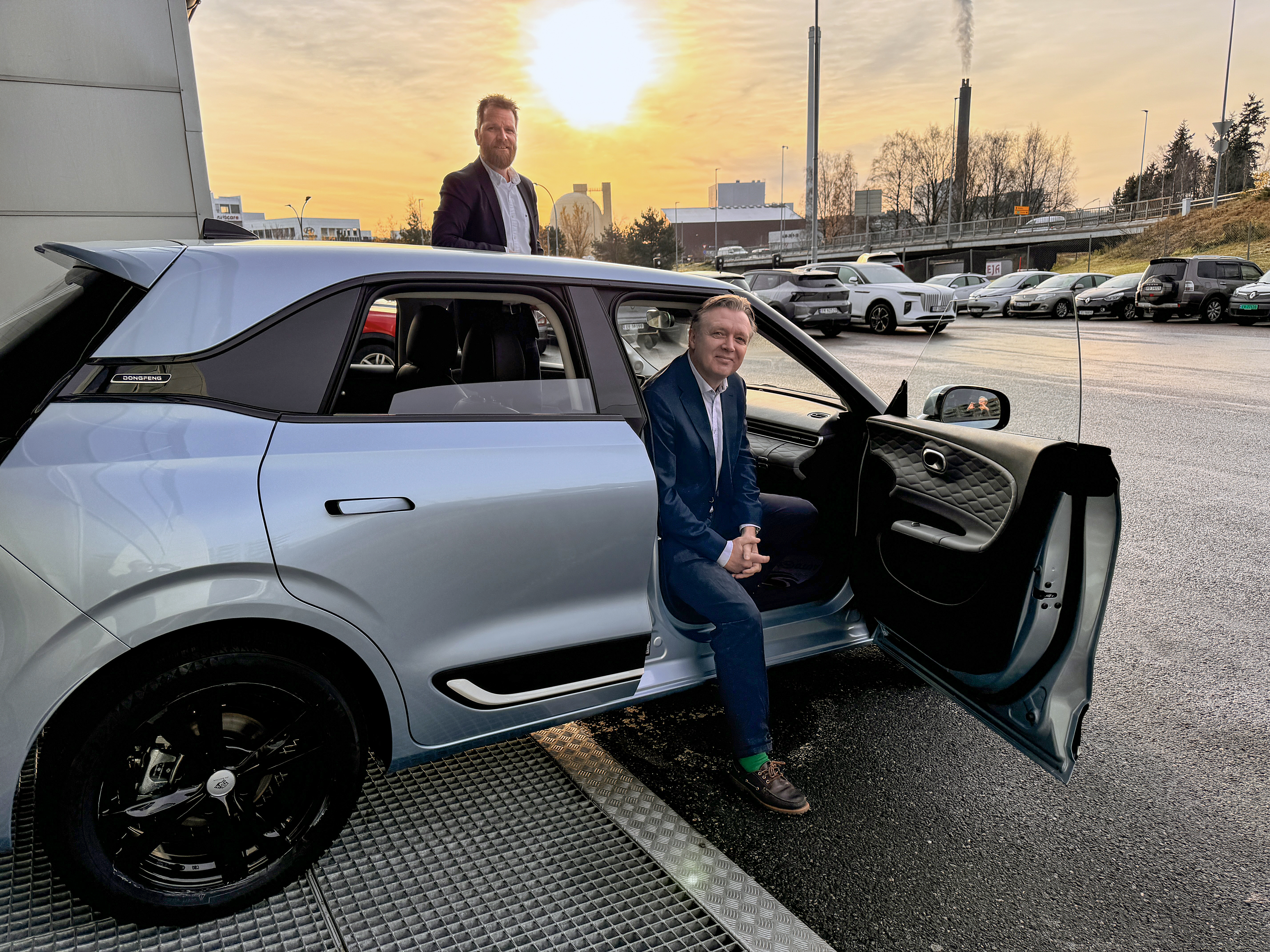 STORE FORVENTNINGER: Dongfeng leverer ny elbil, Nammi BOX, til under 200.000 kroner. Det er en prislapp man tror vil appellere godt til markedet. Her med Morten Brurud, og Kai-Erik Thune. Bilde 1 av 2