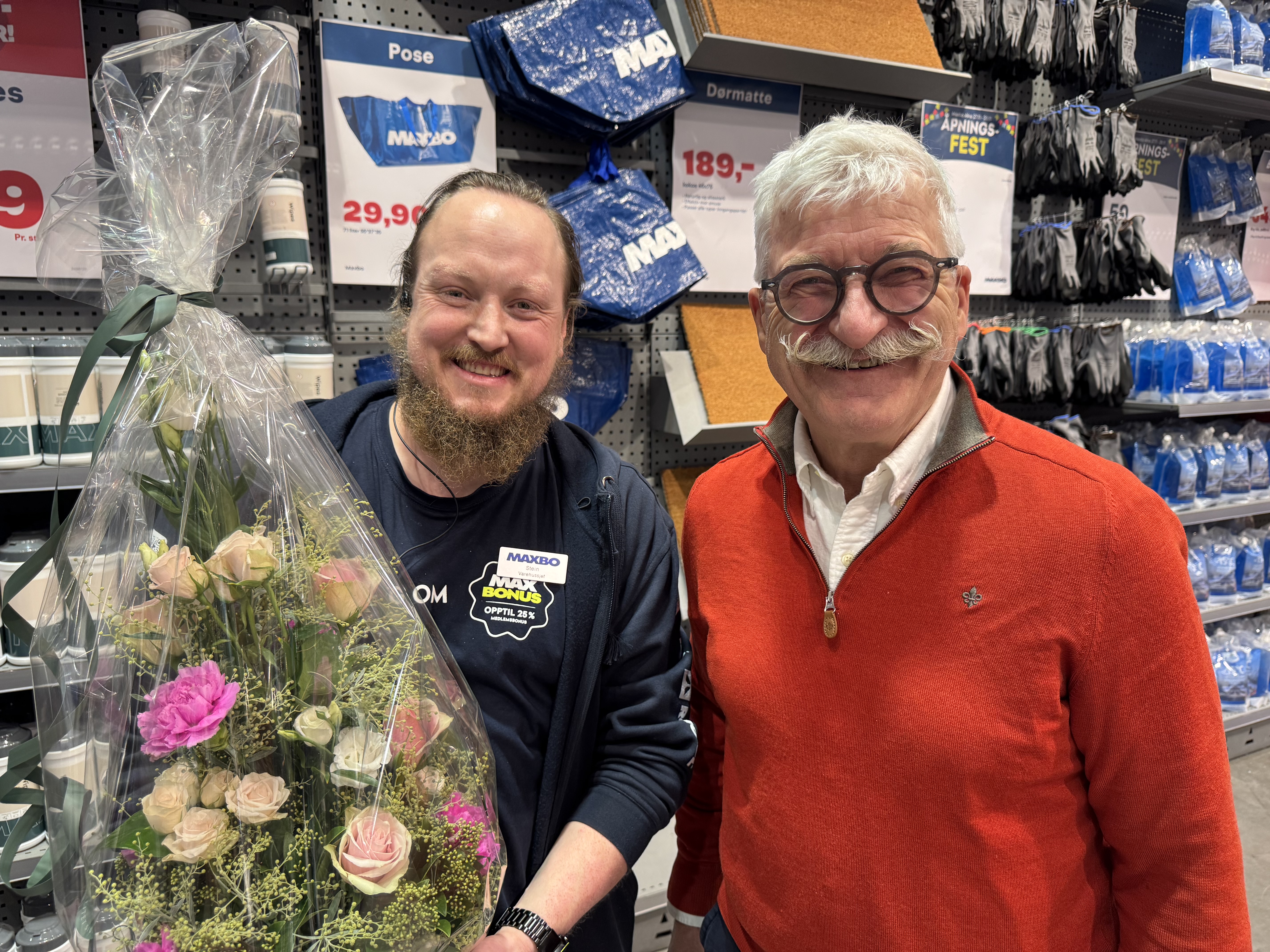 SATSER: Varehussjef Stein Andresen (t.v.) og senterleder Hans Georg Helberg. Helberg overrakte blomster til Andresen under gjenåpningen av Maxbo Alna, som nå står klar for et forventet oppsving i byggevaremarkedet.Bilde 1 av 3