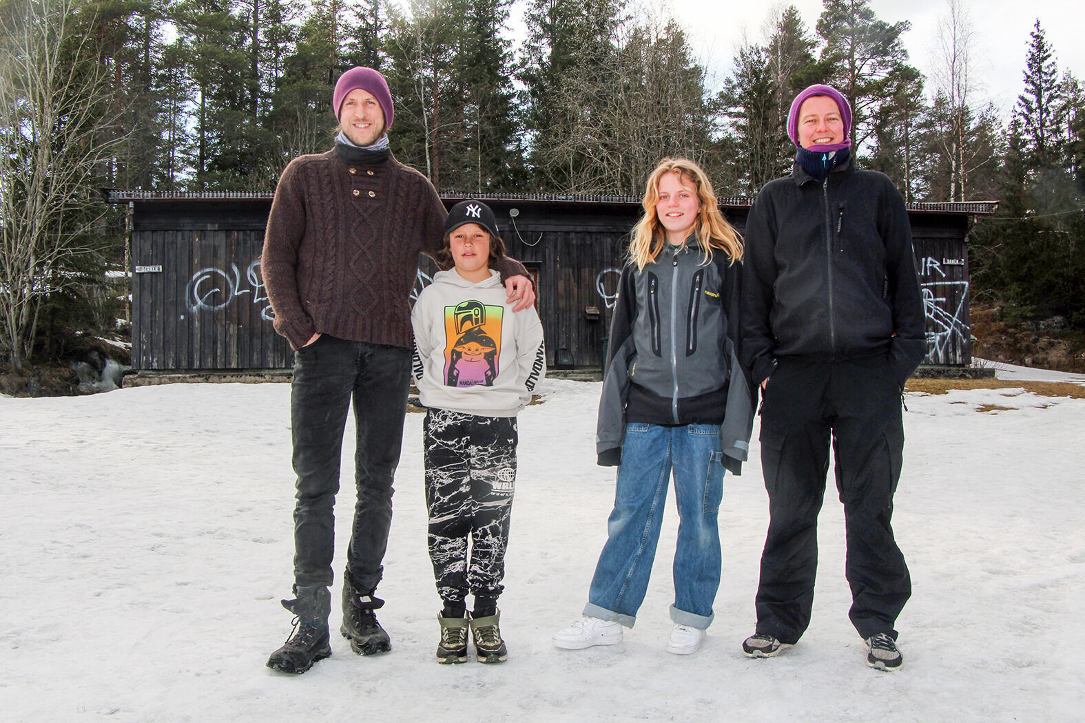 KRUTTHUSET: Turgåere kan på nytt glede seg over kafédrift i Krutthuset ved Steinbruvannet. Der selger Fabien Chaon og Veslemøy Pedersen tradisjonelle kafévarer som kaffe, vafler og boller, og franske godbiter fra Chaons hjemland. Her med barna Axel Chaon Øren og Petra von Krogh. Foto:Bilde 1 av 1
