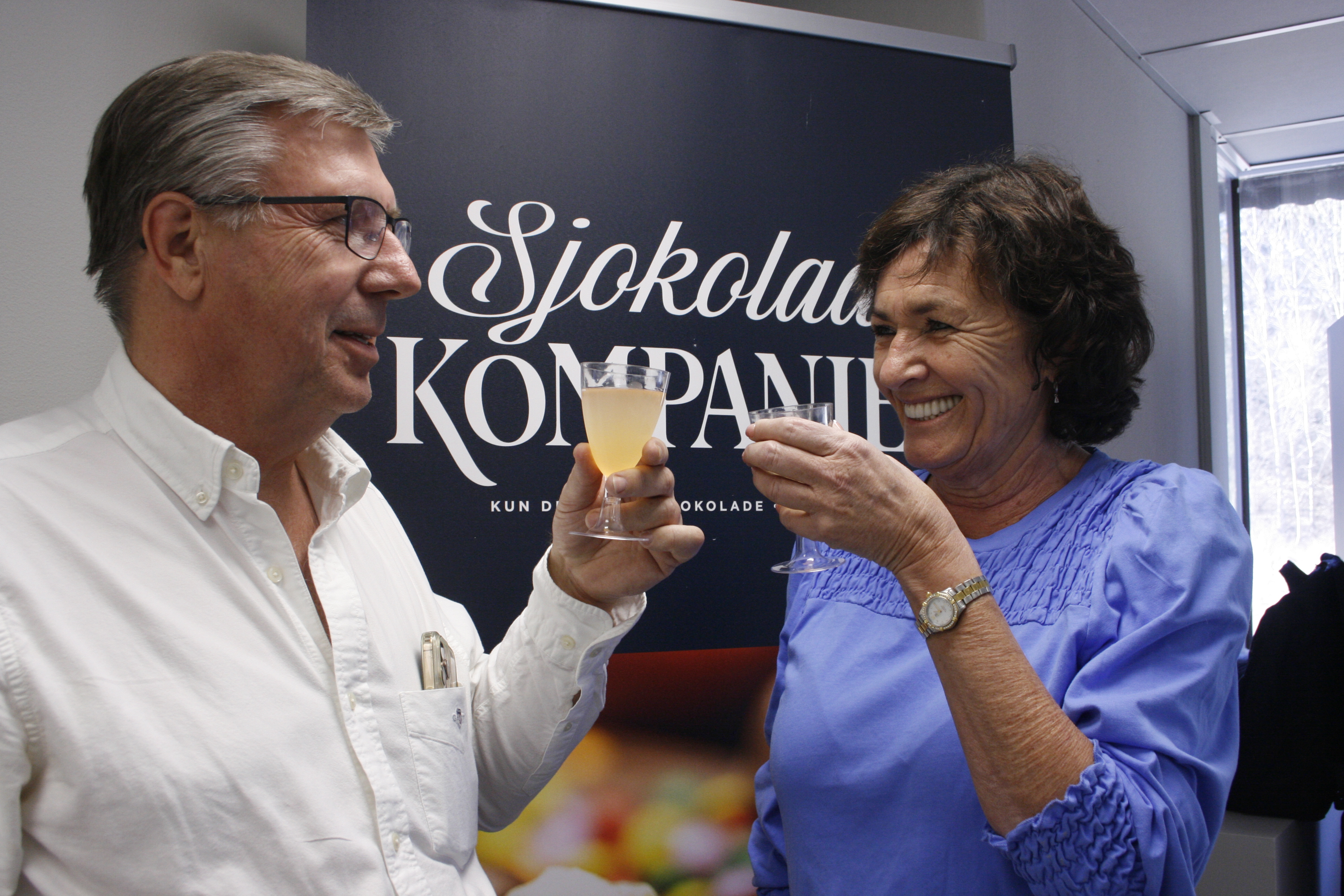 TRIVES PÅ JOBB: Jan Nielsen (t.v.) og Rigmor Nielsen skåler fornøyd for 30 flotte år på arbeidsplassen, der det aldri har vært tvil om at det blir hyggelig å dra på jobb.Bilde 1 av 3