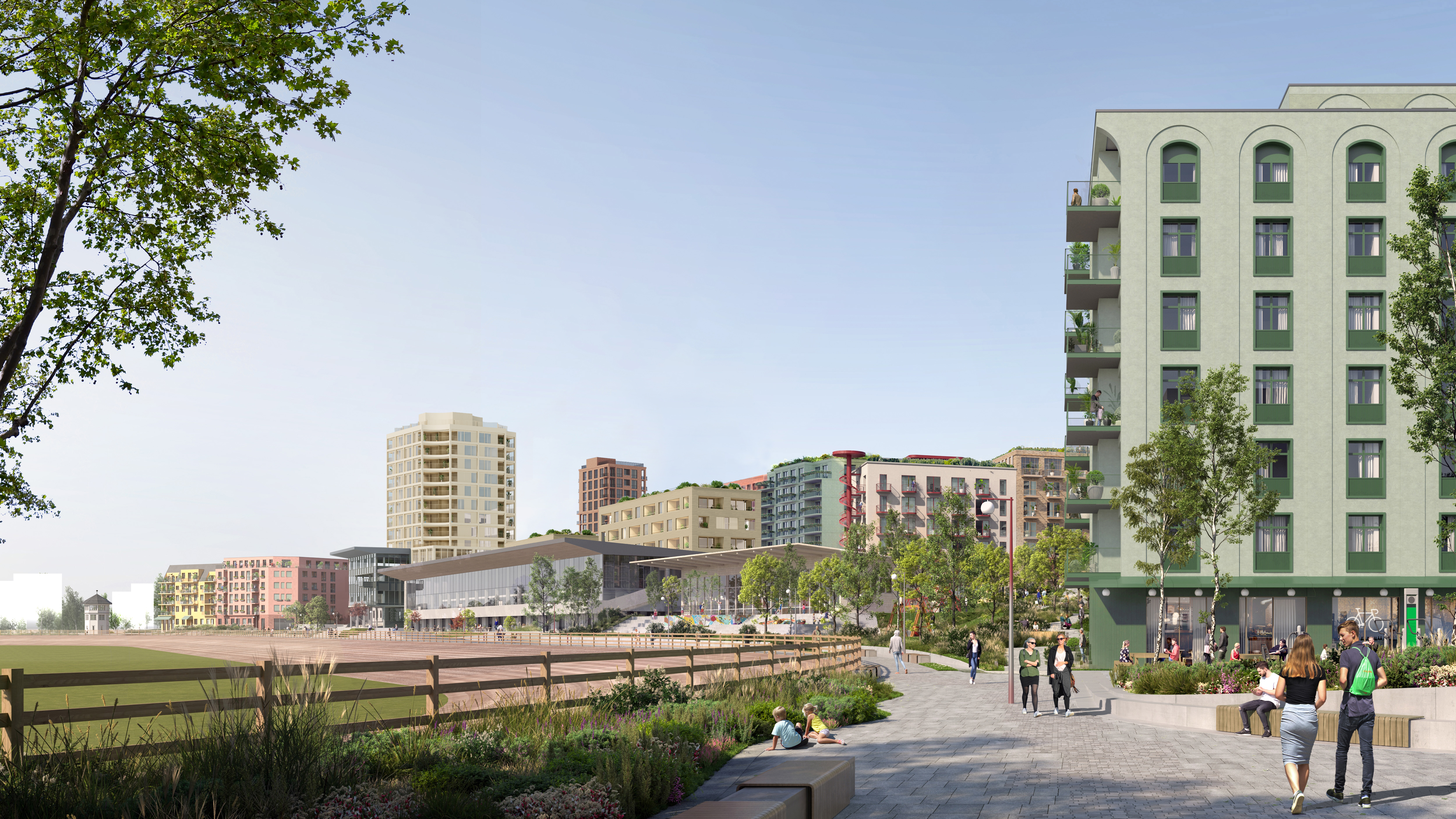 NY BYDEL: Ved Bjerke Travbane i Oslo skal et nytt boligområde snart ta form. Antall etasjer vil variere fra to etasjer mot Bjerke gård og opp til 12 etasjer i to punkthus. I gjennomsnitt vil den nye bebyggelsen ha 5-6 etasjer. Bilde 1 av 3