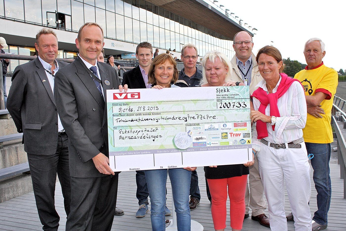 BJERKEBANEN NÅDDE MÅLET: Med ballonger, hester, vogn og radiostyrte biler, koste barna fra barneavdelingen seg på Rikshospitalets dag på Bjerkebanen. Arenasjef Arild Engebretsen nådde målet og kunne signere en sjekk på 200.733 kroner.