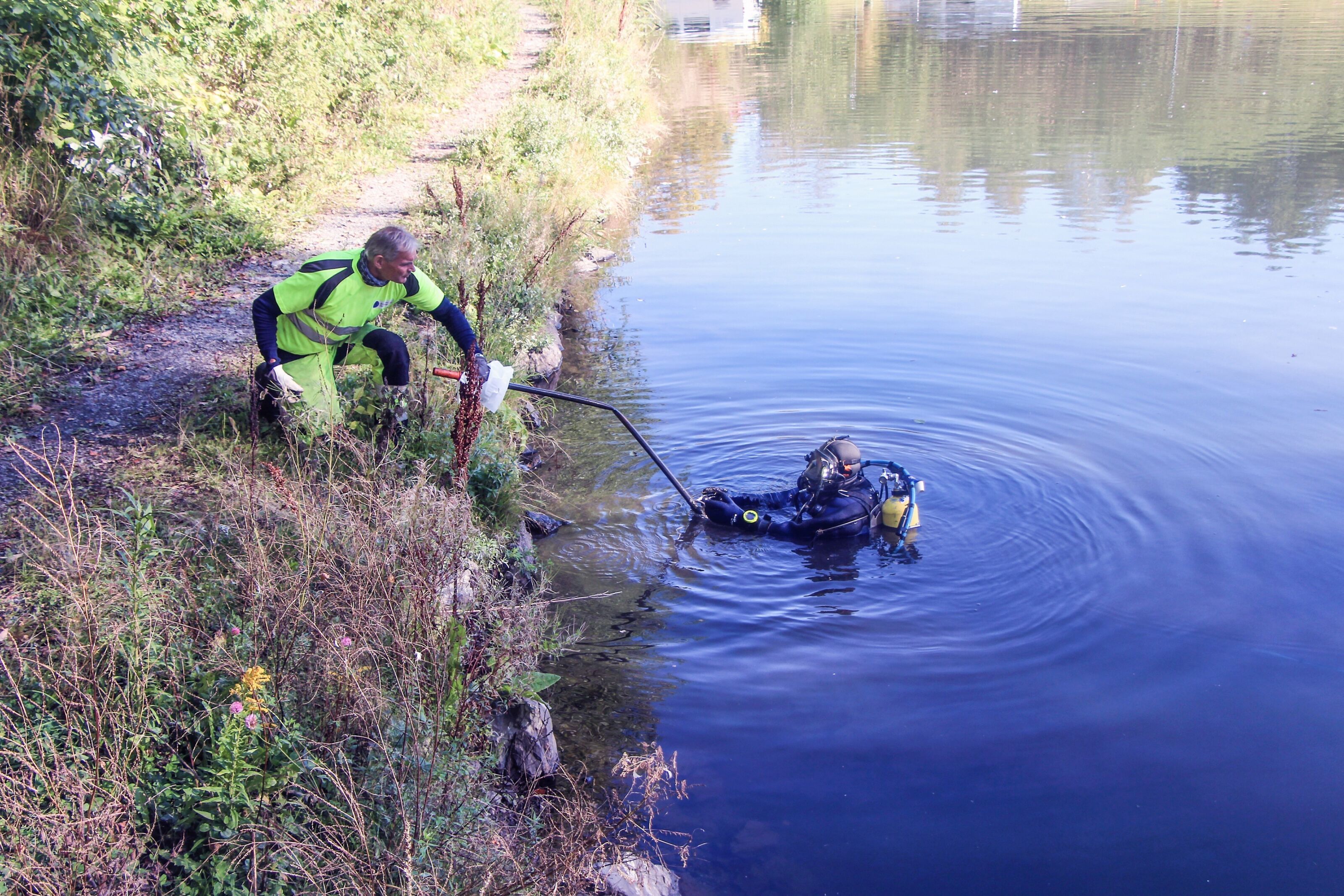 GRORUDDAMEN: Dykkere fra Buskerud Dykkeservice var hyret inn for å rydde i Groruddammen. Det ble ryddet i dammen i fjor også, og det viste seg onsdag da dykkerne denne gangen hentet opp langt mindre avfall enn i fjor. Likevel viser tall fra ryddeaksjonen at det fremdeles er mye avfall i og langs Alnaelva som må tas tak i.