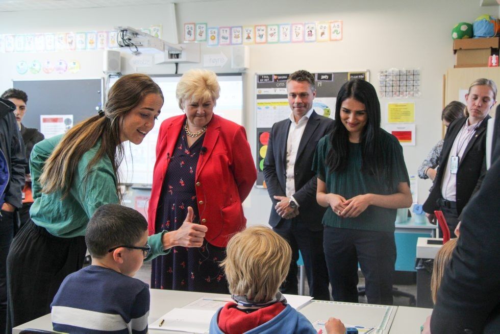 BEFARING: Statsminister Erna Solberg og Høyres ordførerkandidat i Oslo, Saida Begum, fikk se nærmere på skolehverdagen på Sinsen, som sammen med Stovner skole, er blant de beste i landet. Både Solberg og Begum mener elevens skolehverdag blir svekket av byrådets politikk. Her med lærer i 2D, Rebecca Thomassen. Foto:Bilde 1 av 1