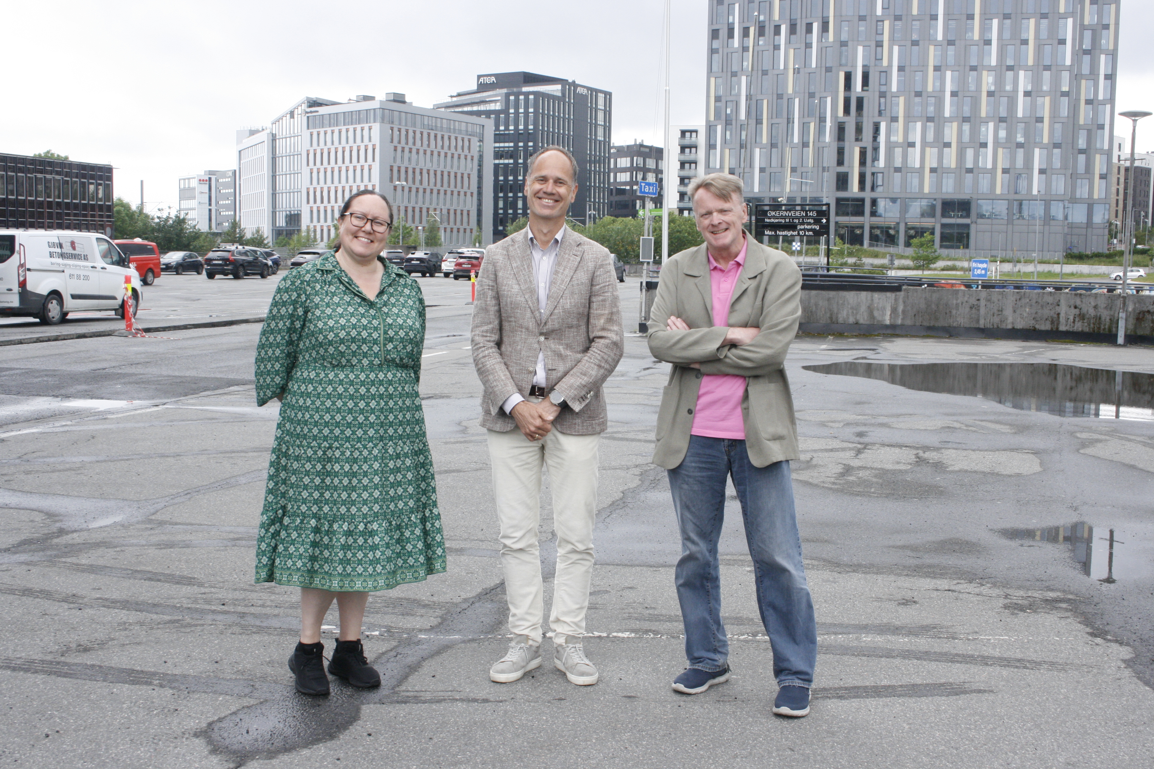 HER KAN DE FÅ BO: Rett på nedsiden av Økern senter, på andre siden av veien fra Økern Portal, har utbygger sett for seg at teateret kan komme. Tina Espejord (Ap, f.v.), Thomas Holth og Egil Husmo (H) håper at befolkningsgrunnlag og mulighet til å tilpasse lokalene helt etter eget behov kan være med på å lokke med seg regjeringen.Bilde 1 av 2