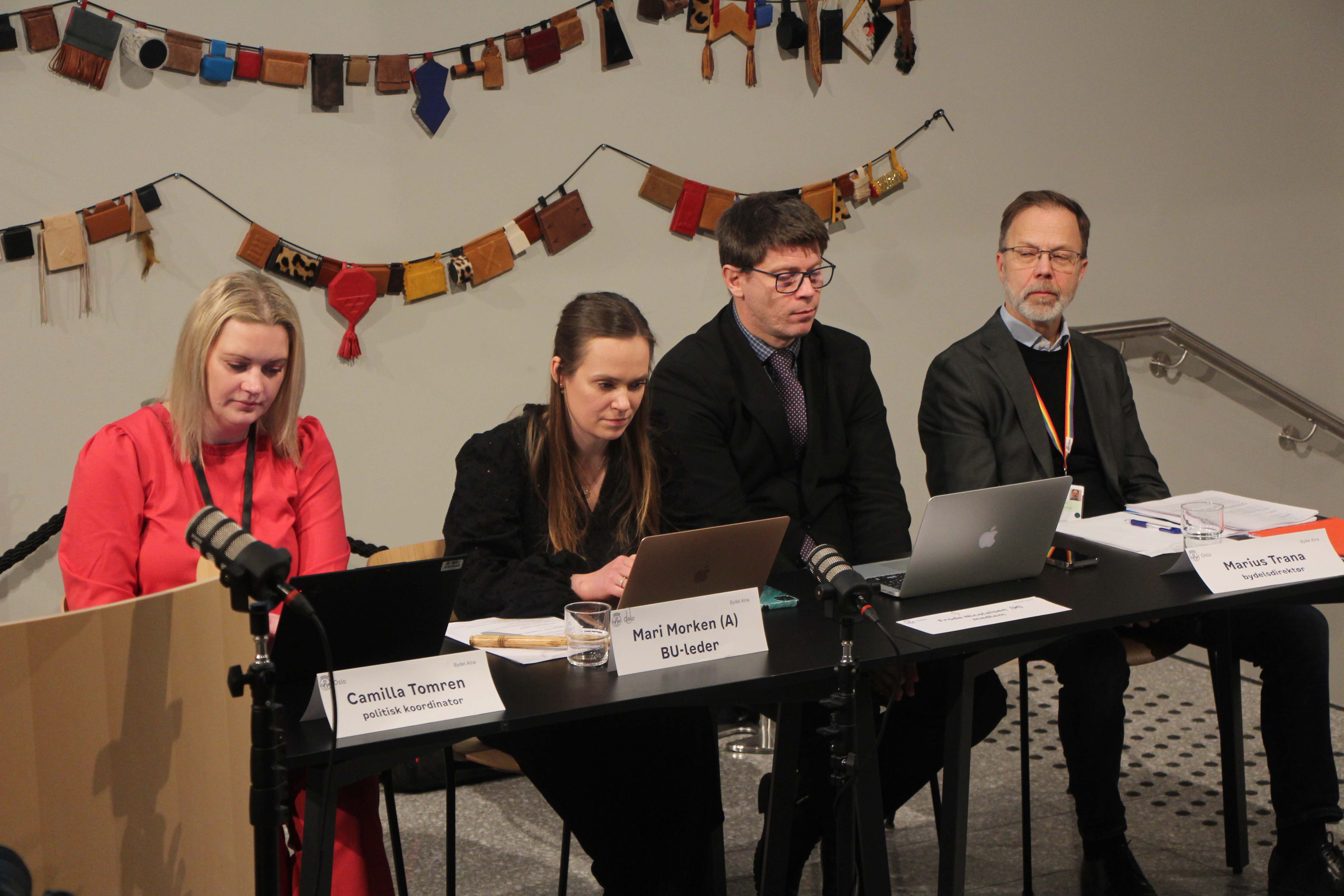 ÅRETS VIKTIGSTE MØTE: Budsjettet er noe av det aller viktigste bydelspolitikerne jobber med. Her med politisk koordinator Camilla Tomren (f.v.), BU-leder Mari Morken (Ap), Frode Nicolaisen (H) og bydelsdirektør Marius Trana.Bilde 1 av 10