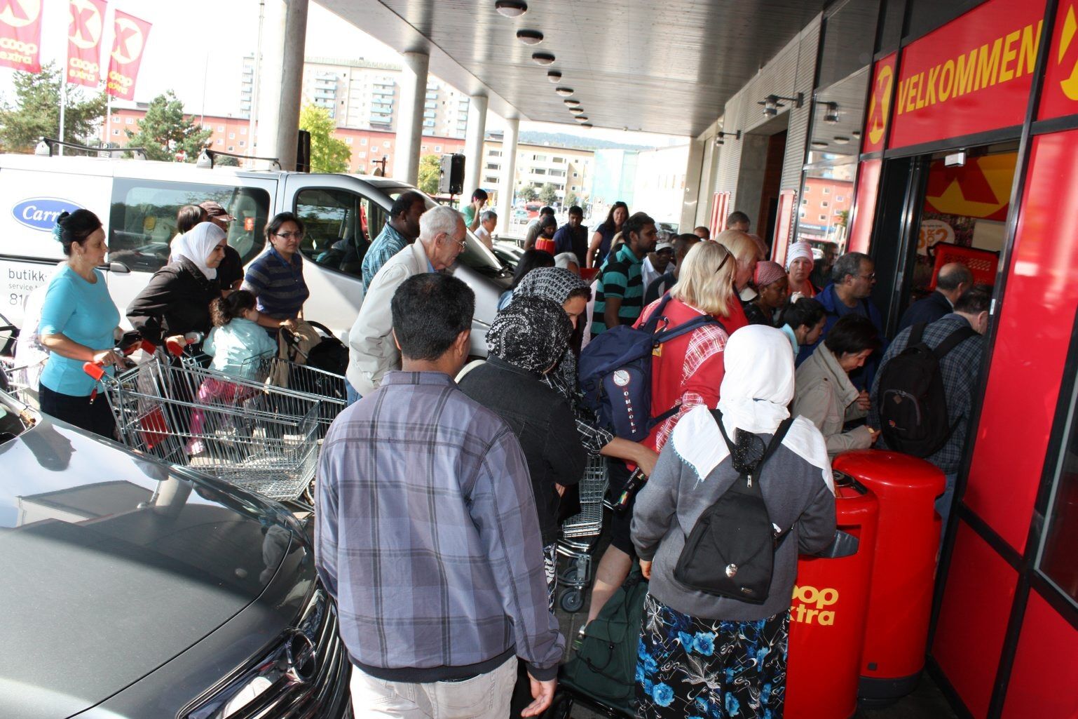 Oslos aller første Coop Extra-butikk åpnet i dag, fredag, på Grorud. En stor folkemengde hadde stilt seg i en lang kø, og da dørene åpnet klokka 12, kjempet folket om å komme inn først.