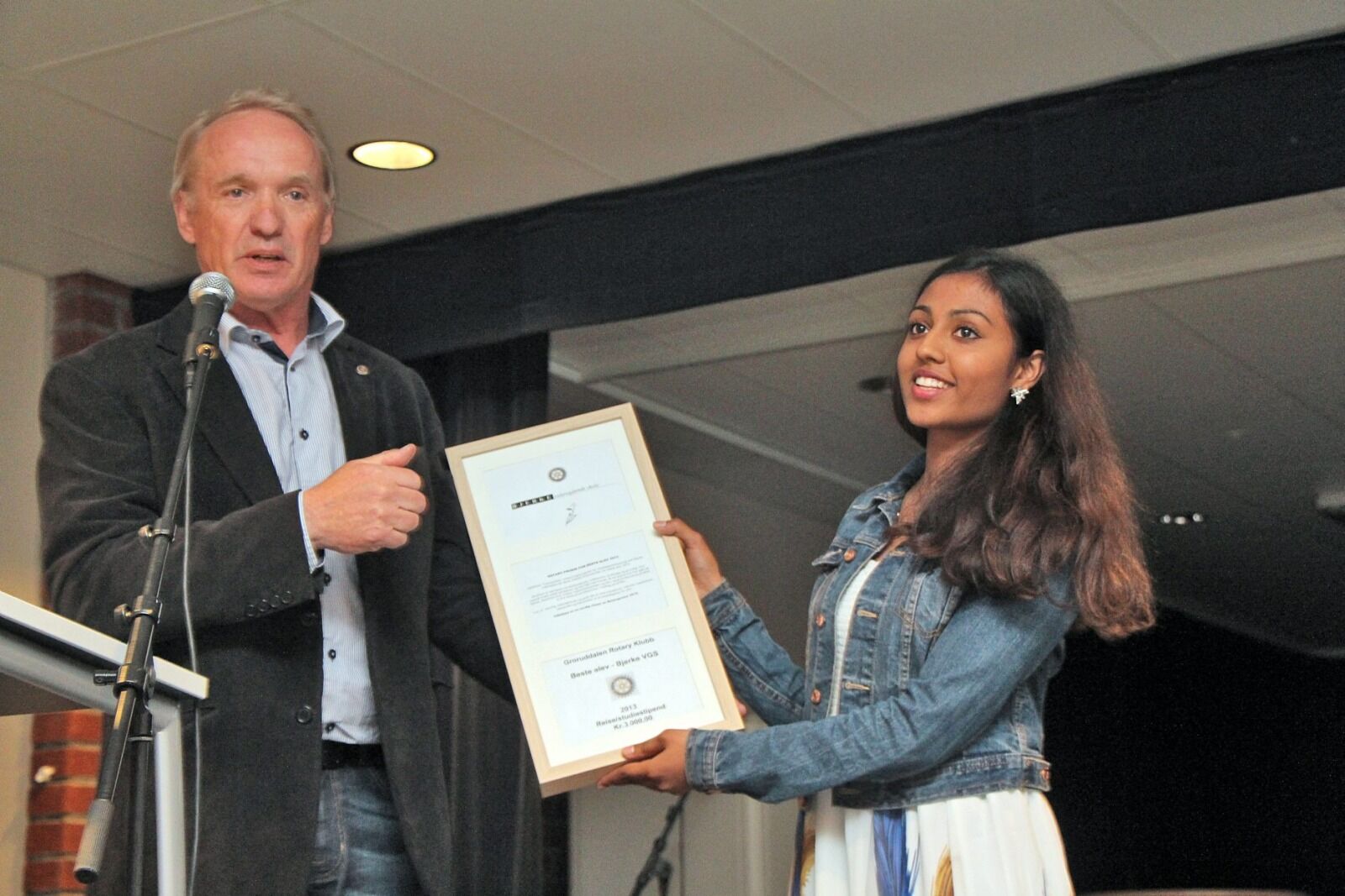 I 13 år har Groruddalen Rotary Klubb årlig delt ut pris til beste elev på Bjerke videregående skole. I år var det Athithiya Thavaseelan som fikk prisen. Under skoleavslutningen ba Rotary-leder Henning Engh henne opp på scenen, og overrakte et diplom. Hun får også 3000 kroner i reisestipend.