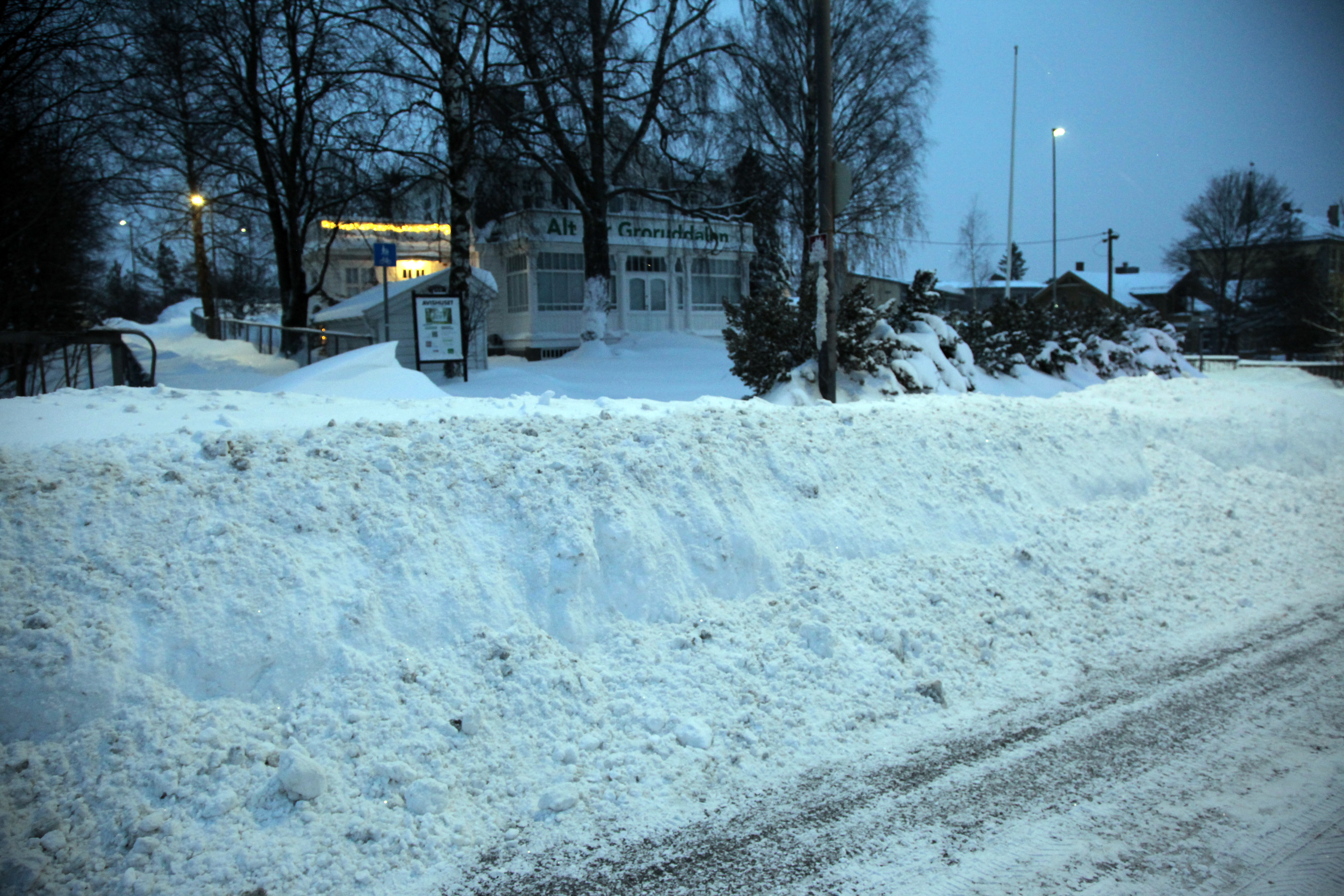 På andre siden av veien må nok de ansatte ved Sigvartsen Steinindustri forberede seg på å vasse i snø nesten til knehøyde for å komme seg inn hovedinngangen når de kommer på jobb i morgen.