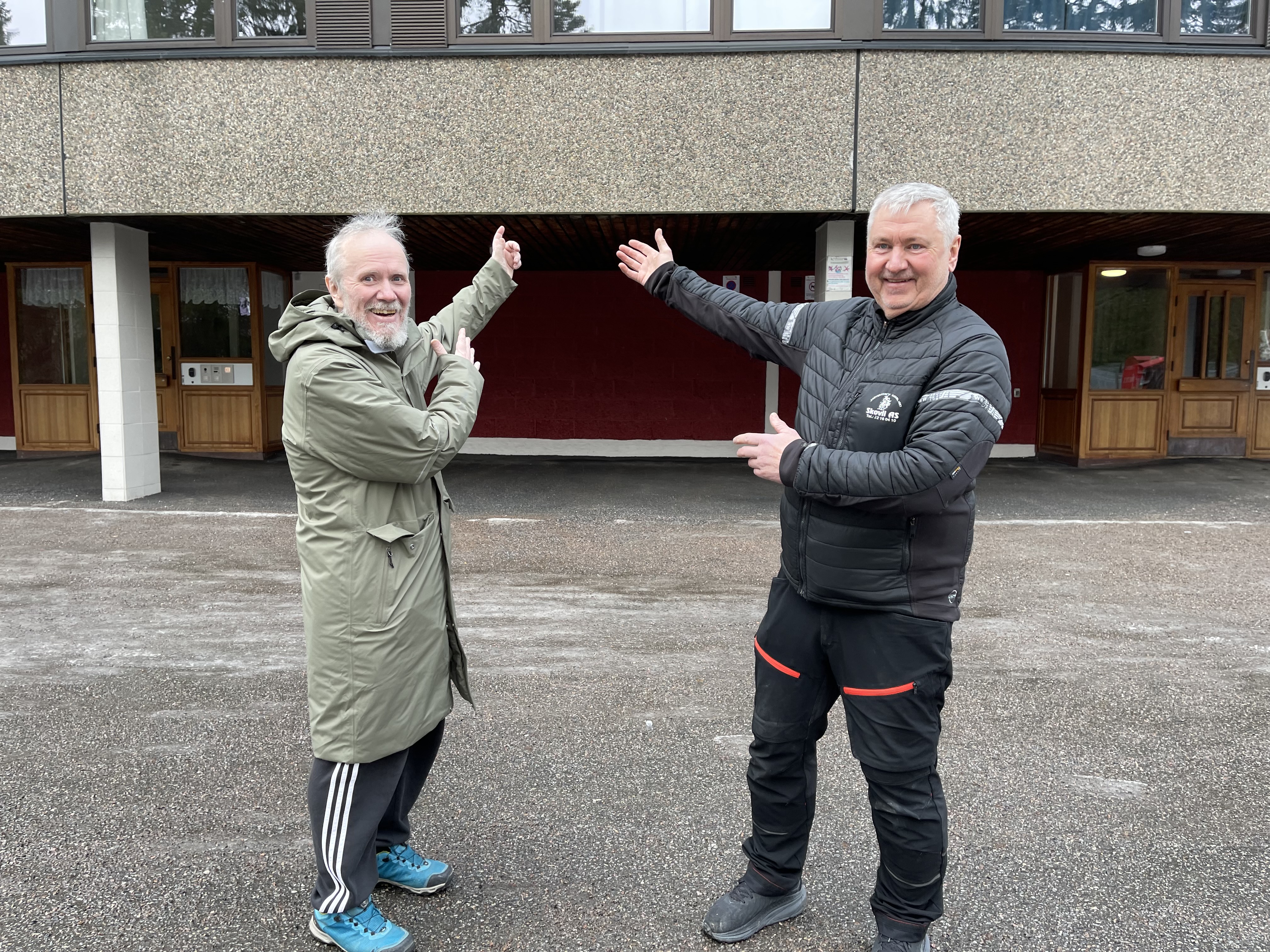 BANANBLOKKA: Ragnar Kjenes og Bjørn Skovli står foran den kjente Bananblokka. Det skal monteres 516 solcellepaneler på en av Norges lengste boligblokker.Bilde 1 av 3