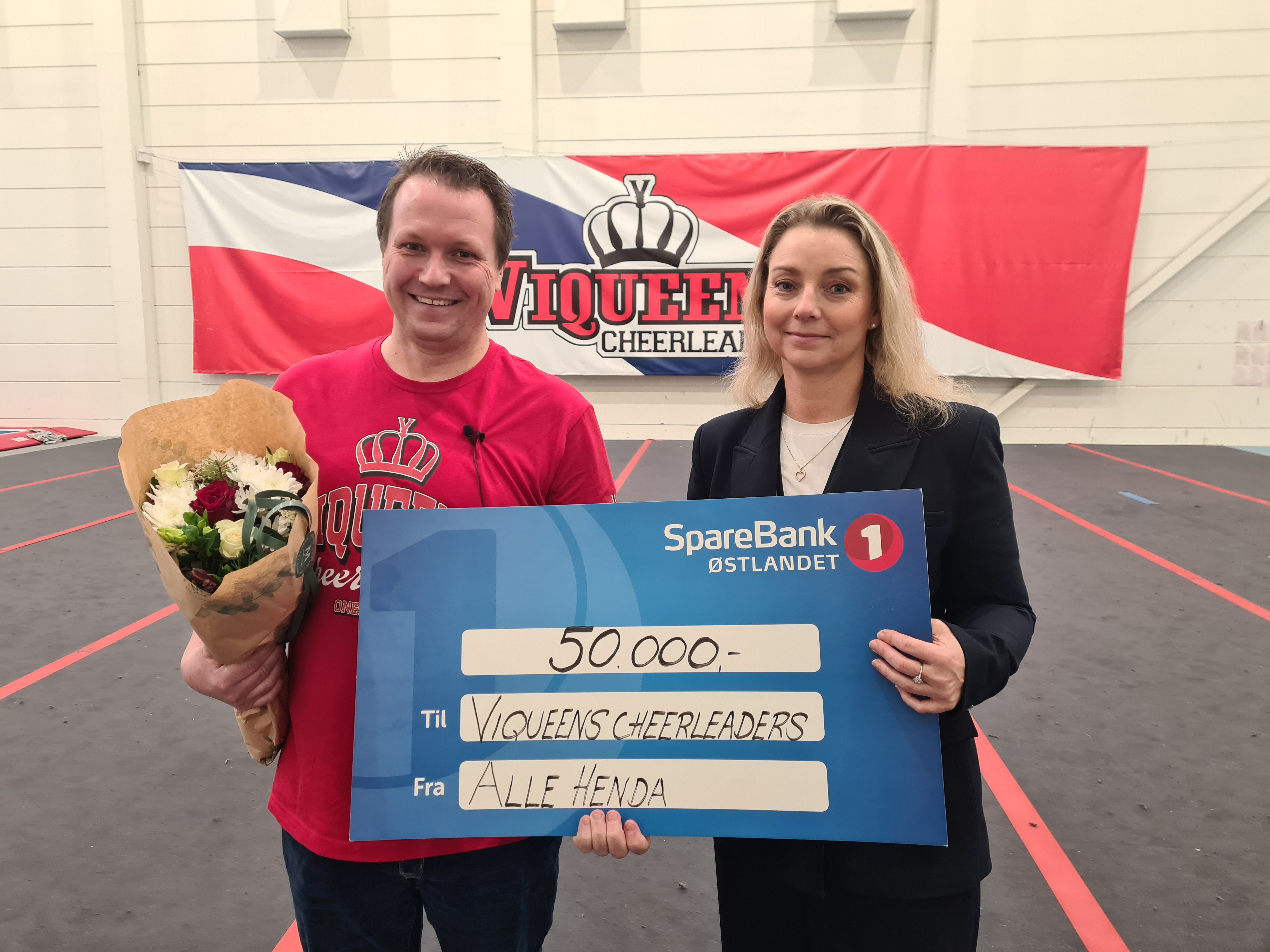 TIL NYE DRAKTER: Frode Stenvik mottok 50.000 kroner på vegne av Viqueens Cheerleaders. Her sammen med banksjef Tone Molstad. FOTO: Martine Myhre ShurdhiqiBilde 1 av 4